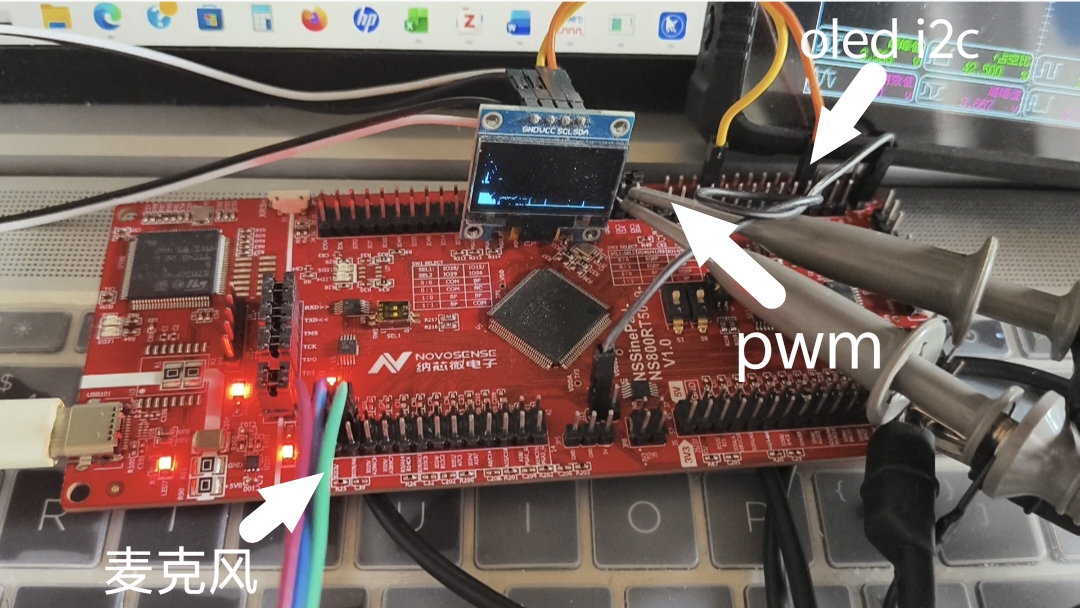 MAX4466模块3.3V供电,OUT连接NS800RT5039评估板的A6口。OLED屏的I2C SCL连接NS800RT5039评估板的GPIO27,SDA连接GPIO26。串口使用板载CMSIS调试器,对应GPIO28、GPIO29两个口。ADC基准Vref脚连接3.3V。PWM输出使用GPIO0和GPIO1。