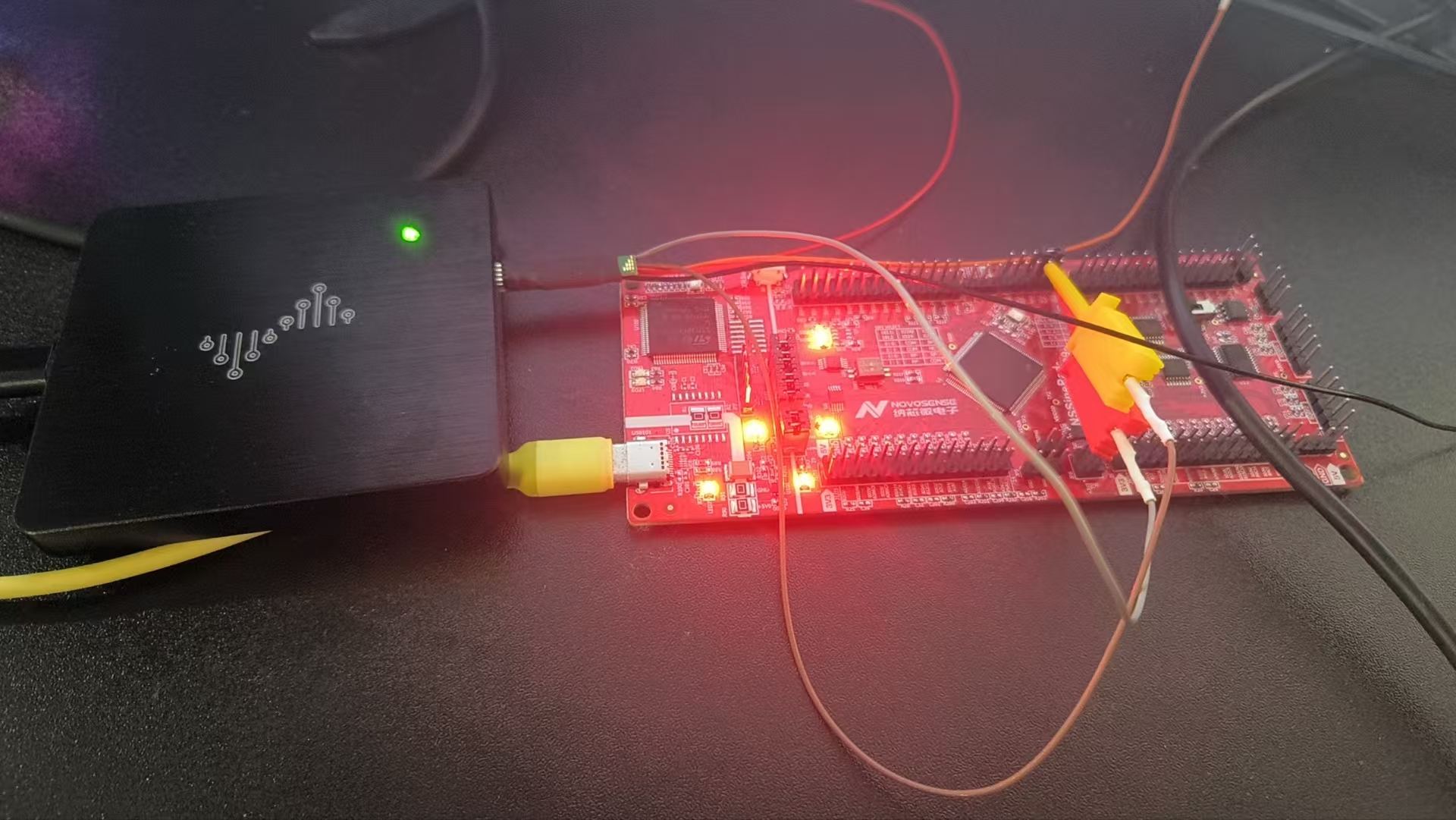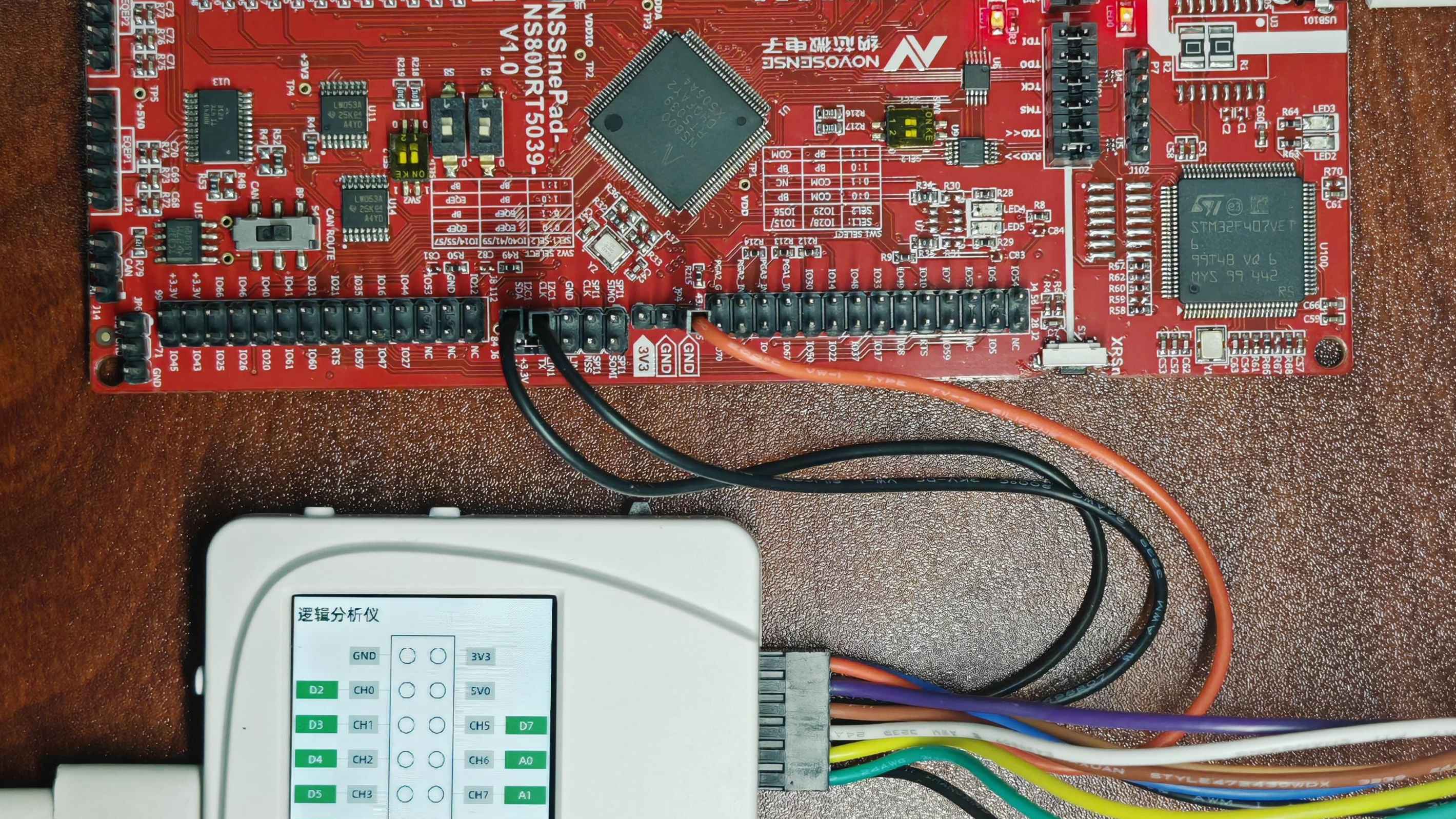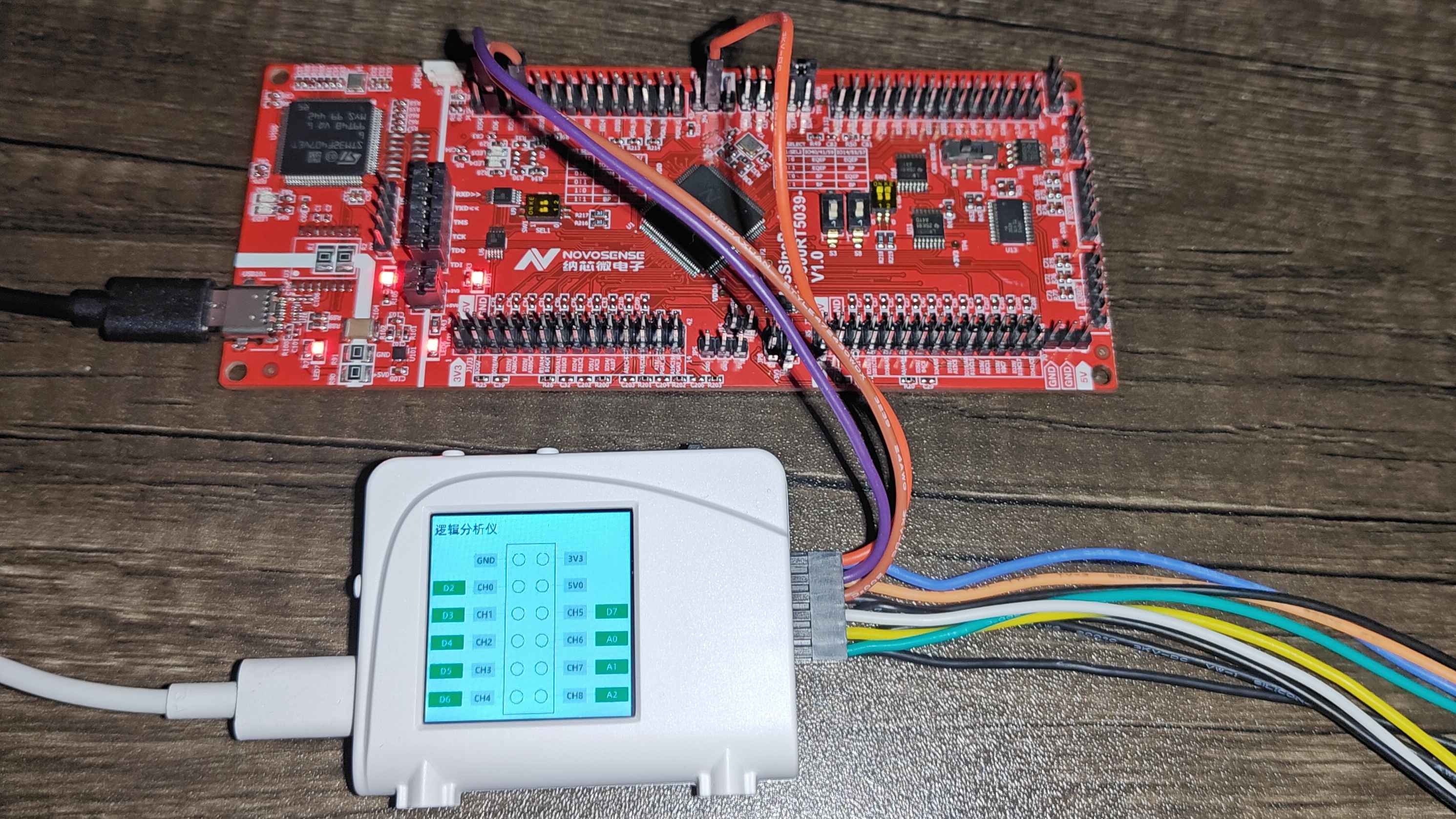 整体的实物连接,电脑通过一根USB线连接至开发板,通过逻辑分析仪连接至开发板EPWM 1A和1B的输出引脚。