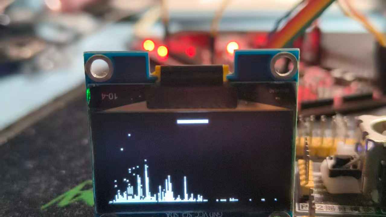 - 功能模块:RC 低通滤波器(1.6kΩ 电阻 + 10nF 电容)、驻极体麦克风、0.96寸O LCD 屏;