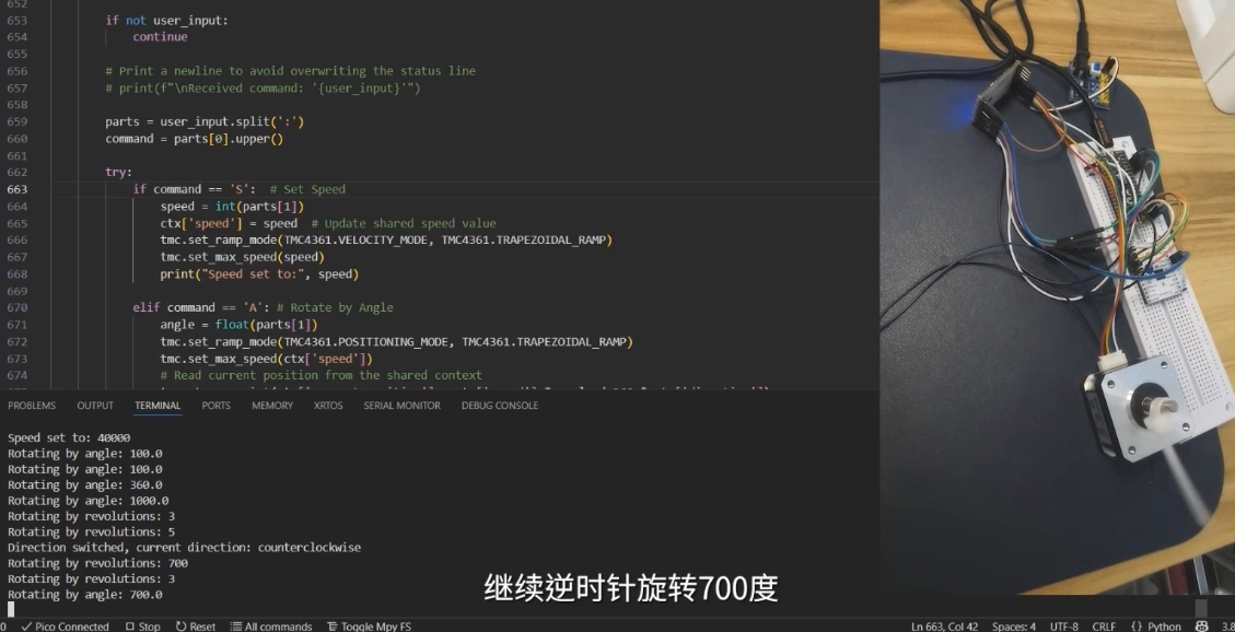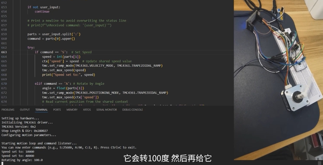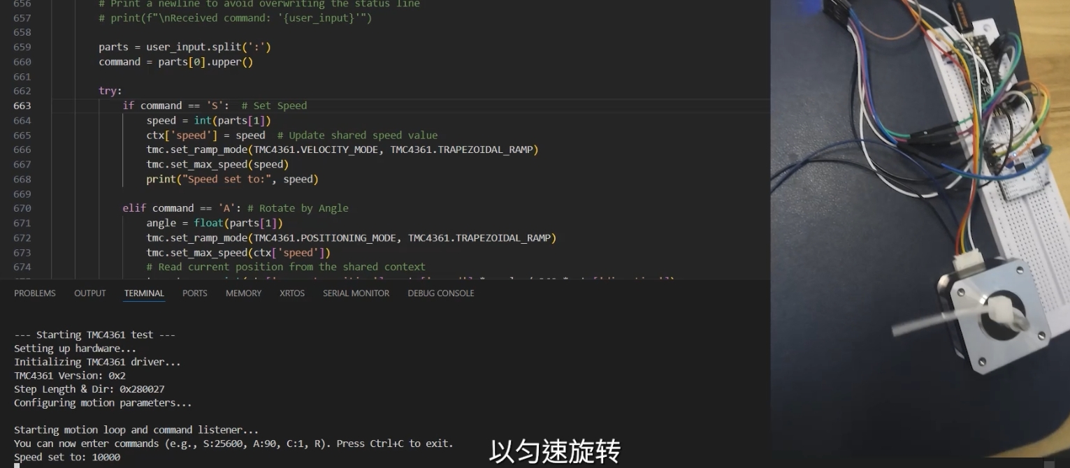当检测到命令为 'S' 时,程序会将TMC4361运动控制器设置为 速度模式 (VELOCITY_MODE)。然后,它会调用 `tmc.set_max_tmc.set_max_speed() 函数,将用户设定的速度值发送给控制器。这会使电机以指定的速度持续旋转,直到接收到新的指令。