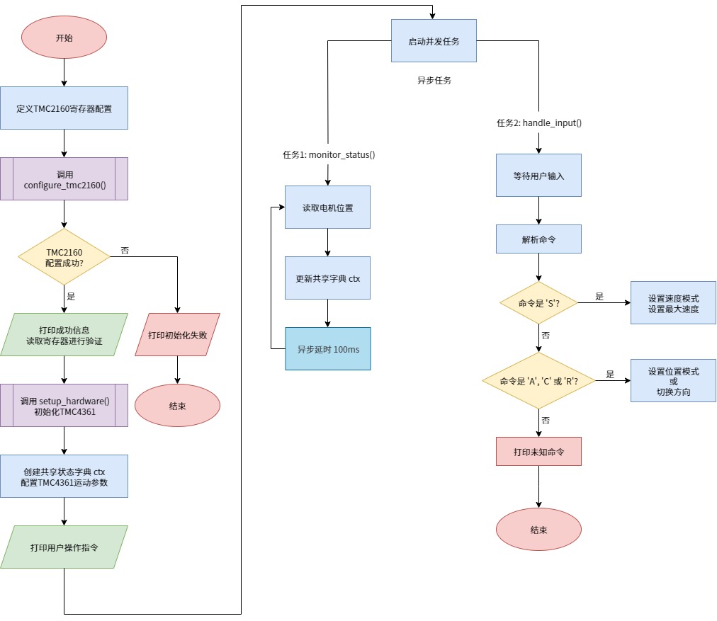 位于 main 异步函数中,是整个程序的入口和调度中心。它首先定义了一个名为 ctx 的共享上下文词典,用于在不同的并发任务之间安全地传递和共享数据(如速度、方向、当前位置等)。使用 uasyncio.create_task() 启动了两个核心的并发任务:monitor_status(状态监控)和 handle_input(用户输入处理),让它们并行运行。