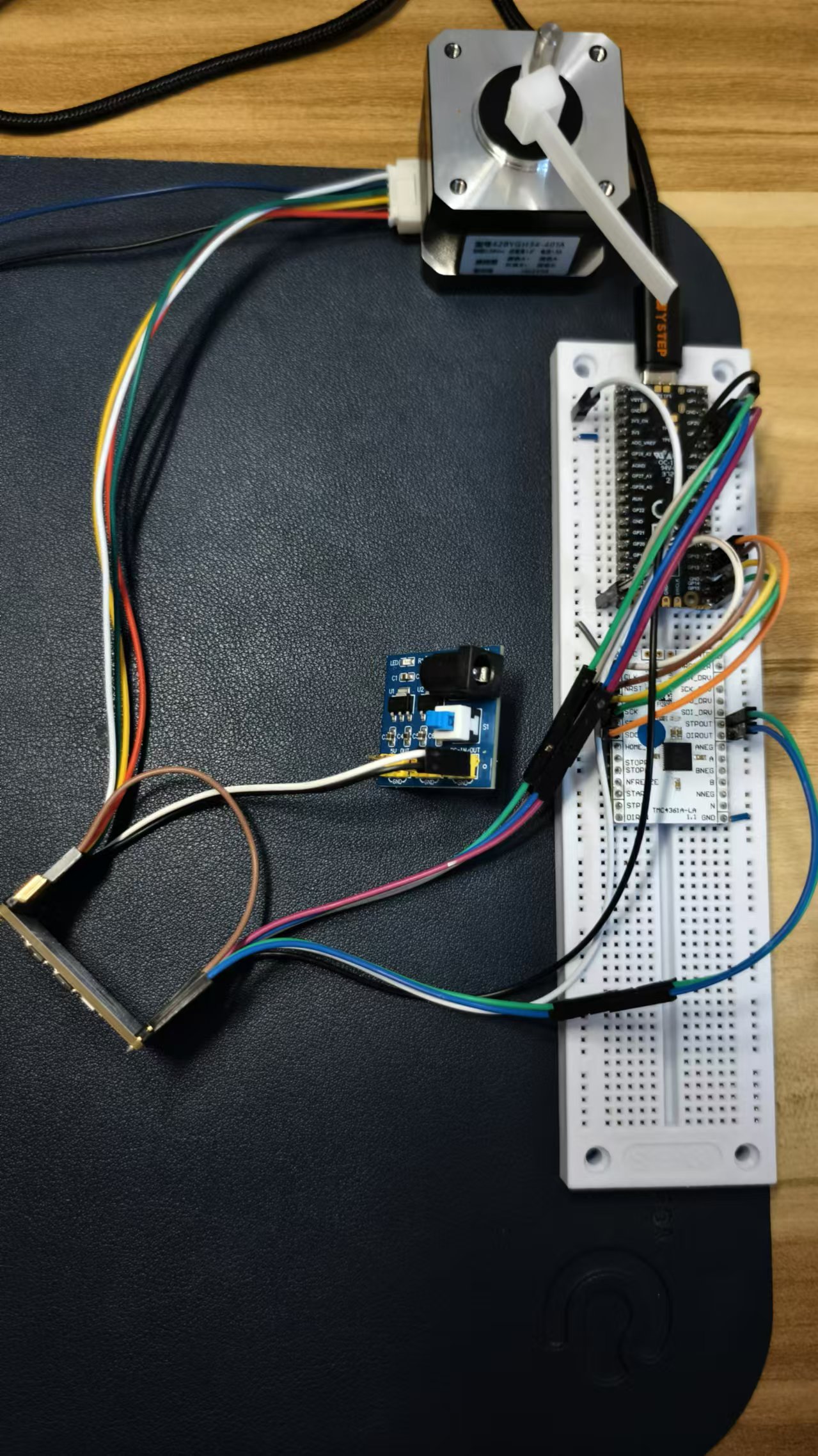 本项目选用来自ADI的板卡(TMC4361A-BOB&TMC2160-BOB板卡)连接步进电机,使用树莓派Pico实现电机定速旋转、指定角度旋转、指定圈数旋转、正反转切换功能。在电机控制过程中,TMC4361A是电机运行状态控制芯片,TMC2160是电机驱动芯片,树莓派Pico用于配置两种芯片功能,并处理用户的输入。