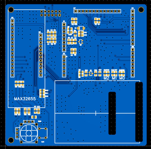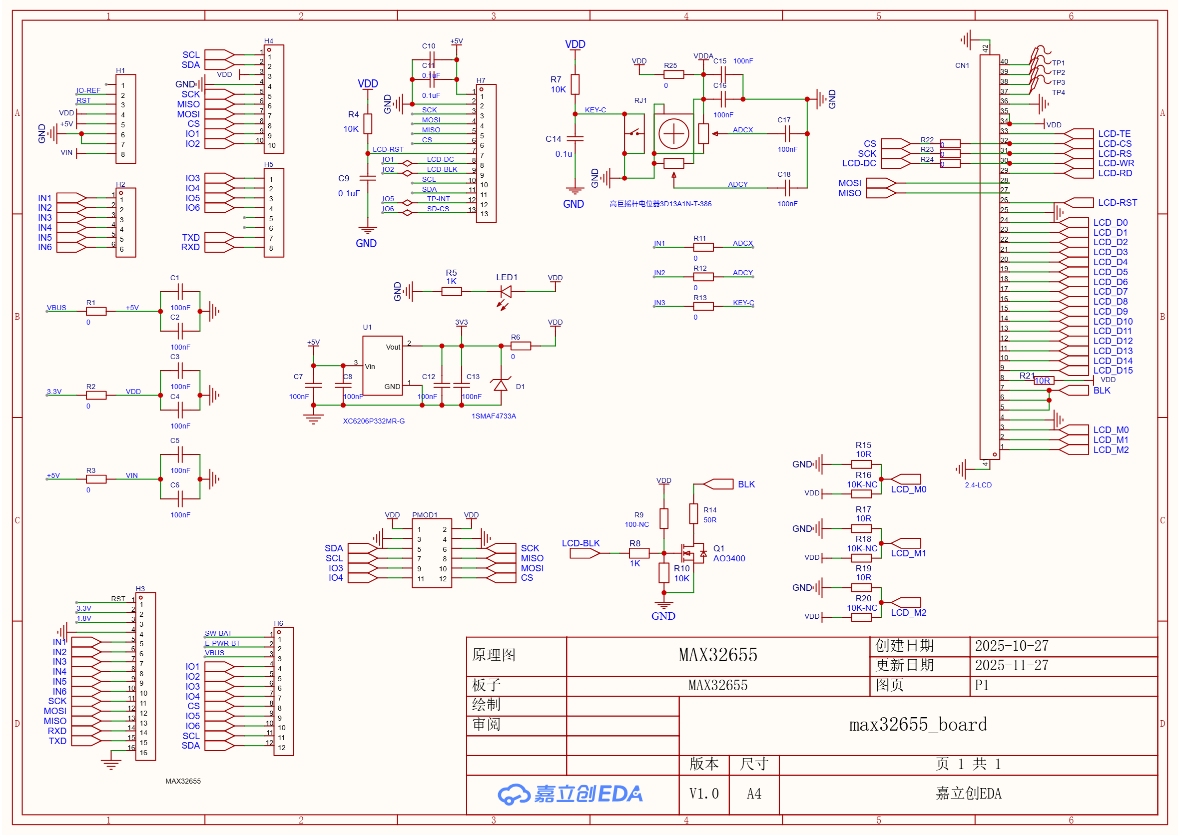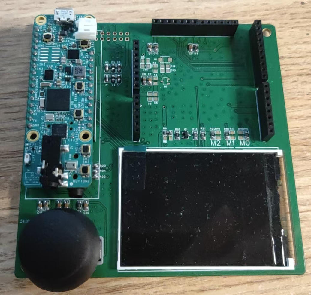 针对本次任务,我设计了基于MAX32655FTHR开发板的扩展板,板载摇杆XY双轴,用于ADC采样。板载一个2.4寸LCD屏,分辨率为320*240。另外还扩展了一个arduino接口,可以用于外接其他设备。这里设计一个瑕疵就是ADC采样基准电压只能选择VDD/2或者内部1.22V,达不到3.3V,导致摇杆的有效范围很小。