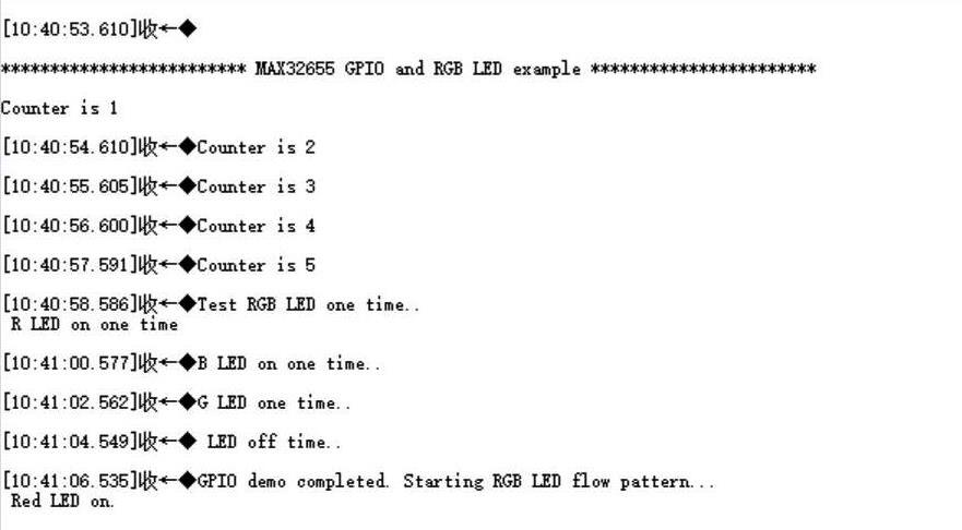 先套用MAX32655 GPIO官方例程,在此基础上增加流水灯效果:RGB LED引脚定义, RGB_LED引脚初始化,定义RGB颜色控制函数, 定义RGB_流水灯函数,使用板载LED驱动函数 运行流水灯1, 启动RGB流水灯2。