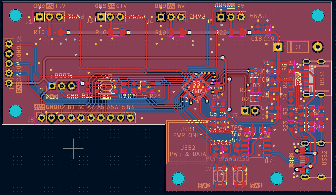 我使用KiCad 7.0进行了一版PCB设计。PCB采用低成本的双层板设计,外形为L形。串口通信及PWM波形输出在实际测试中表现稳定,满足了项目需求。