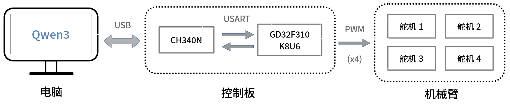 本项目的整体设计采用"电脑-控制板-机械臂"的交互架构,系统框图如下:
