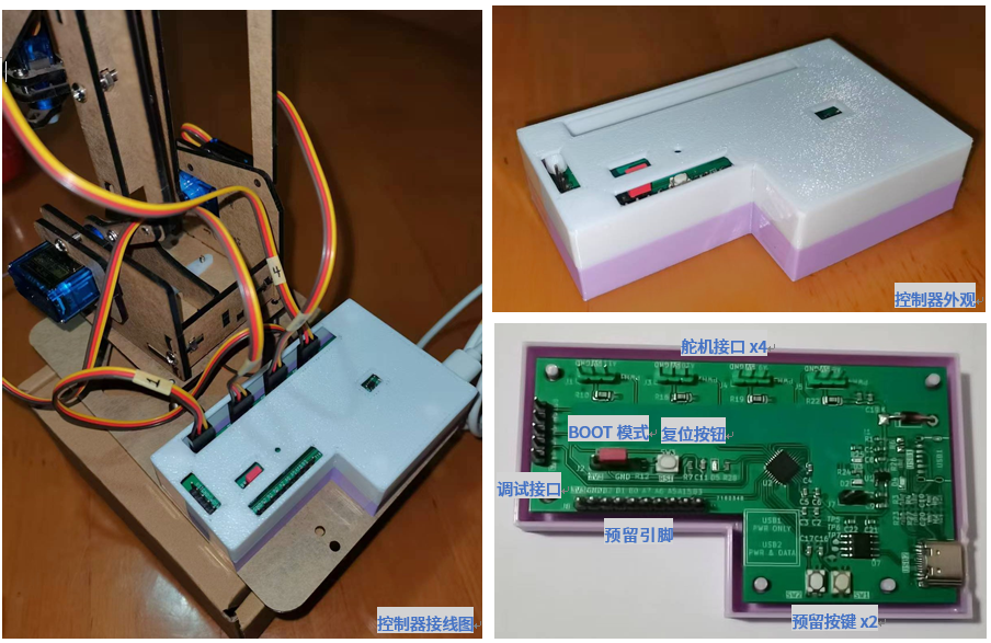 控制板PCB提供4个SG90舵机接口、一个USB通信兼供电接口、MCU调试接口和复位按键。对于感兴趣的使用者,控制板预留了2个用户按键并引出多个MCU引脚,方便外接其他模块实现自定义功能。
