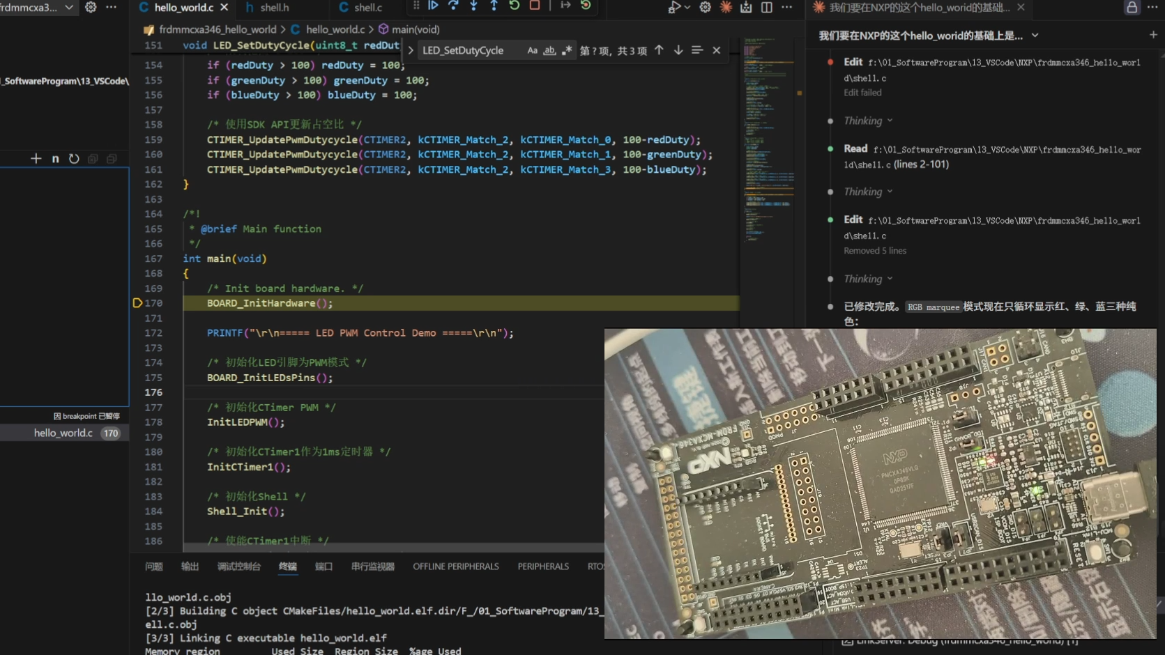 本项目选用来自NXP的板卡(FRDM-MCXA346)连接RGB灯,设计一个简易shell,通过串口与用户进行交互,并根据用户输入的命令控制板载 RGB LED 的颜色与亮度。