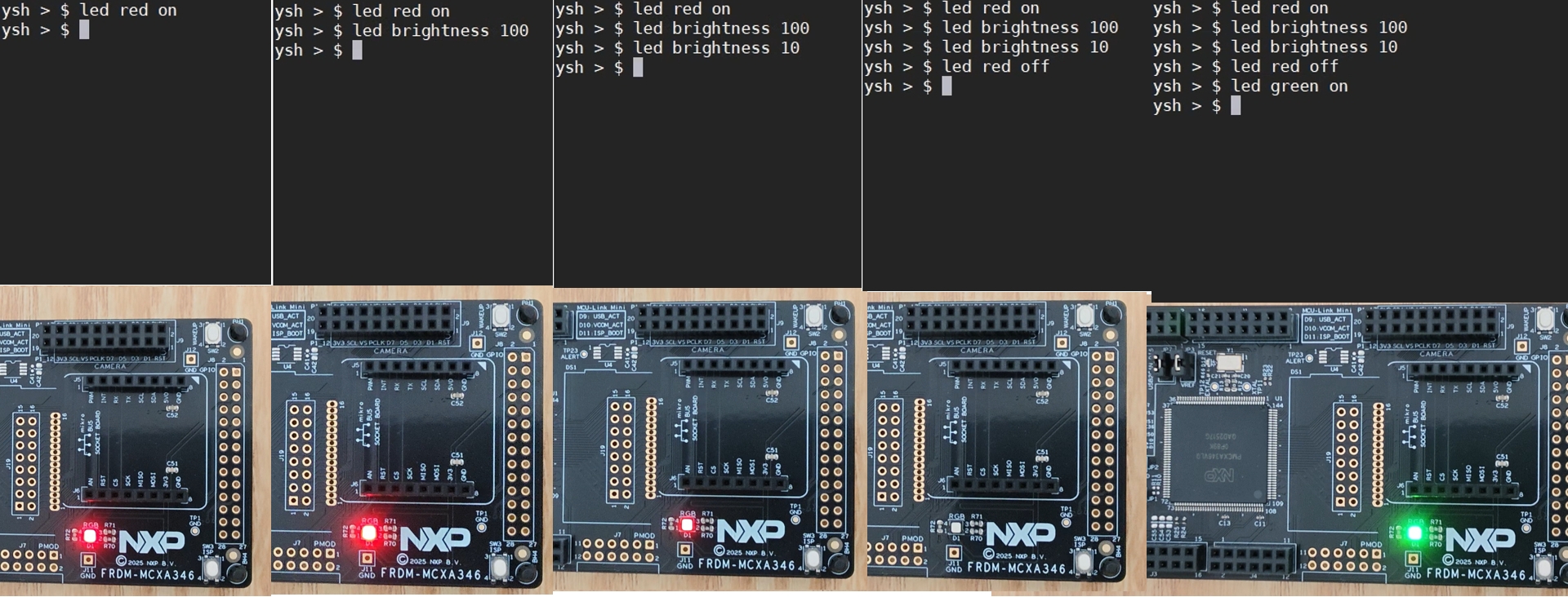 根据第二个参数判断是控制颜色还是亮度。如果是颜色("red", "green", "blue"),则根据第三个参数 (argv[2]) "on" 或 "off" 来设置 PWM 占空比。on 设置为 50% 亮度,off 设置为 0% 亮度。如果是 "brightness",则将第三个参数用 atoi 转换为数字,并计算出对应的 PWM 占空比值。最后,将计算出的新 PWM 参数应用到 CTIMER 硬件,LED 状态立刻发生改变。