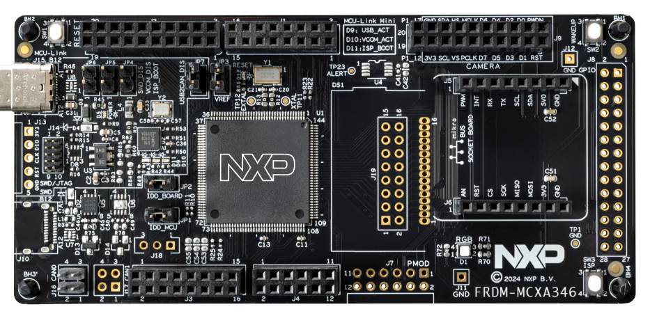 FRDM-MCXA346板卡基于MCX A346微控制器,其采用Arm Cortex-M33内核,最高运行频率达180MHz,内置高达1MB的闪存和256KB RAM(其中包含8KB纠错码ECC),并集成了乘法累加单元(MAU)与SmartDMA,支持控制器局域网灵活数据速率(CAN-FD)、低功耗通用异步收发器(LPUART)、低功耗串行外设接口(LPSPI)、低功耗内部集成电路(LPI2C)等多种通信接口,同时配备DMA控制器和低压差稳压器(LDO)。板上设有一颗用户RGB LED(D1)以及电源/MCU-Link状态指示灯;板载MCU-Link调试器支持CMSIS-DAP,并提供虚拟串口(VCOM)功能,默认连接至LPUART2以实现打印调试。该硬件适用于工业自动化、电机控制以及IoT边缘计算领域,并通过兼容Arduino®的接头提供了灵活的扩展选项。
