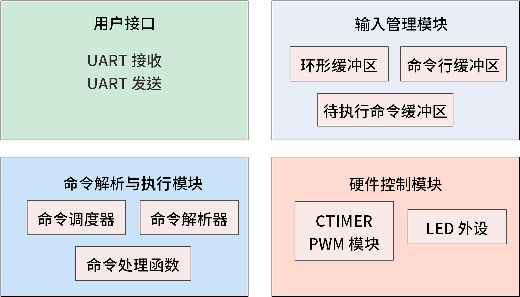 - CTIMER PWM:利用硬件定时器生成 PWM 信号来控制 LED 亮度,相比于使用软件延时(会阻塞 CPU),这种方式几乎不占用 CPU 时间,使得 CPU 可以去执行其他任务,如处理更复杂的命令。