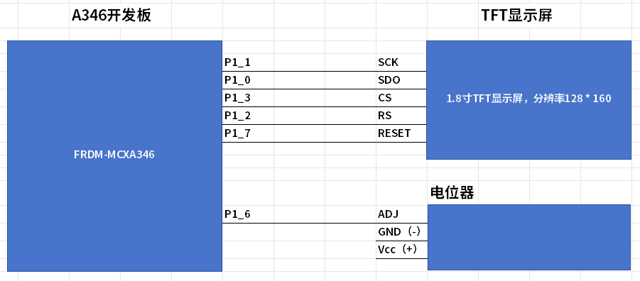 按照以下方式设置FRDM-MCXA346开发板、TFT显示屏之间、可调电阻