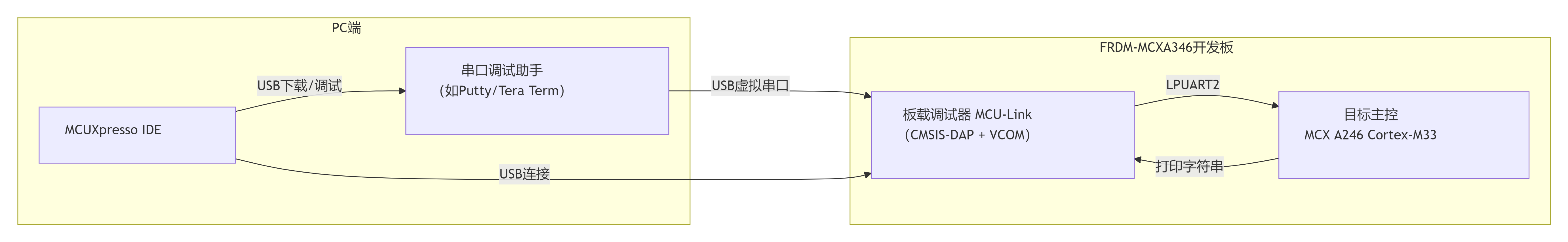 本项目旨在基于FRDM-MCXA346开发板,编写并实现一个基础的串口通信例程。项目的核心目标是通过开发板的LPUART接口,向PC端串口调试助手循环打印“Hello, DigiKey Funpack 5-1.”字符串。此项目作为DigiKey Funpack 5-1活动的基础入门任务,主要目的是熟悉FRDM-MCXA346开发板的基本操作、MCUXpresso IDE的开发流程以及板载MCU-Link调试器的一体化调试与串口通信功能,为后续更复杂的嵌入式应用打下基础-1-5。