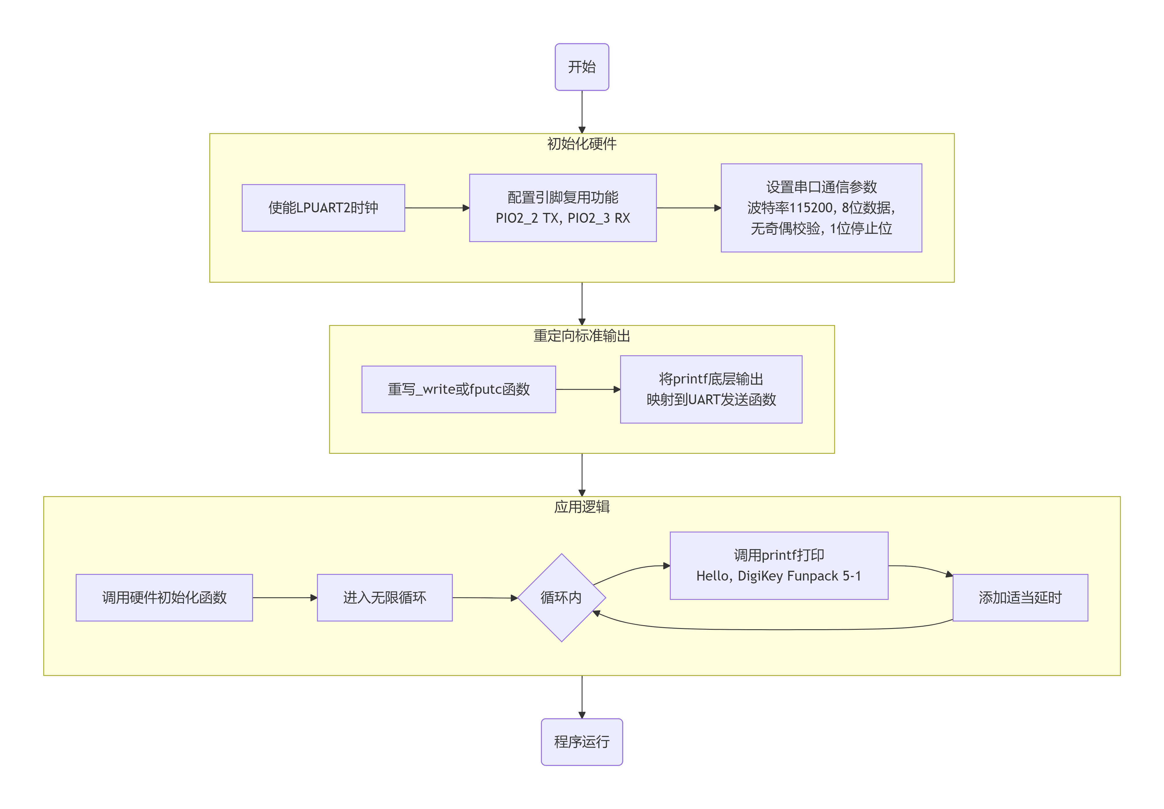 printf函数是标准输出函数。为了方便开发者使用,通常会将printf的底层输出函数(如_write或fputc)重定向到已初始化的UART发送函数。这样,上层应用调用printf时,数据就会自动通过串口发送出去。 - 编写应用逻辑:在主函数中,调用初始化函数后,进入一个无限循环。在循环内,使用