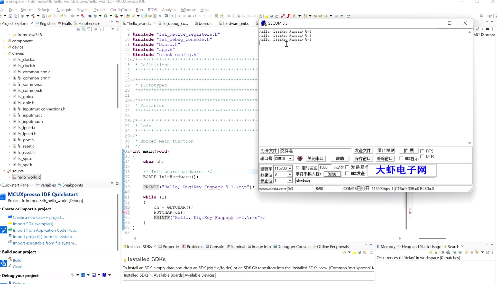 printf函数打印目标字符串“Hello, DigiKey Funpack 5-1.”,并添加简单的延时,以防止数据发送过快导致缓冲区溢出或难以观察。