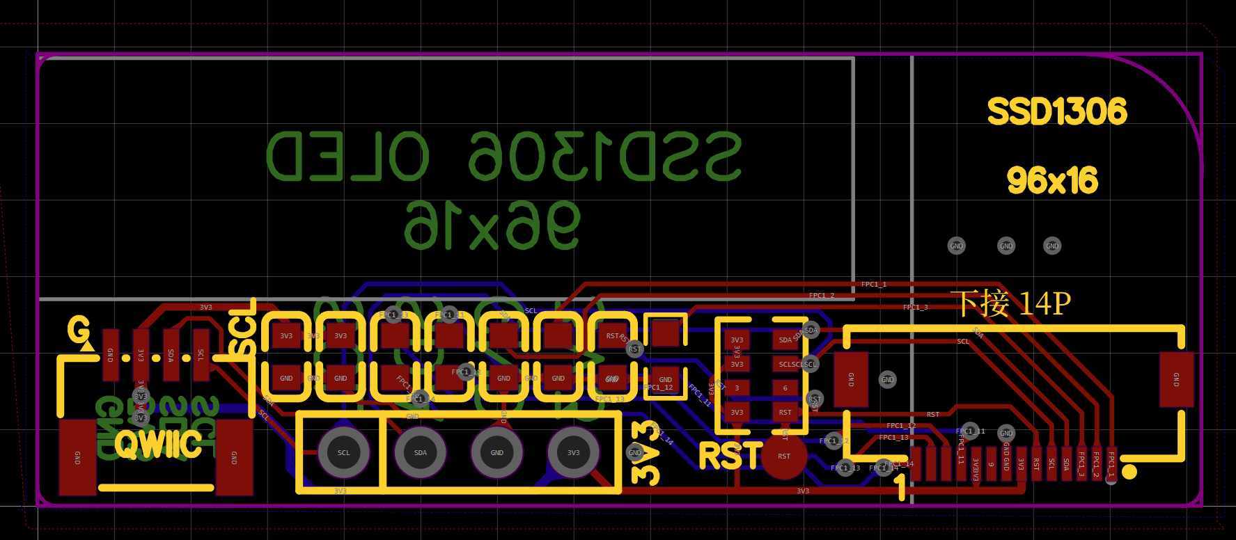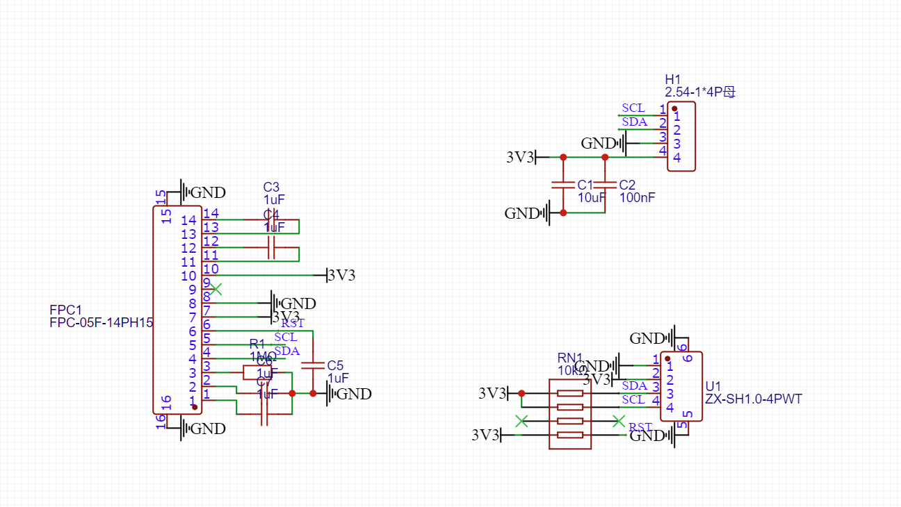 温度传感器使用排母与板子相连接。OLED屏幕自带升压,所以电路比较简单,参考着网上的电路,使用fpc座与屏幕连接。整个模块使用一个QWIIC(SH1.0,1mm间距,4P接口)接口与主控连接。