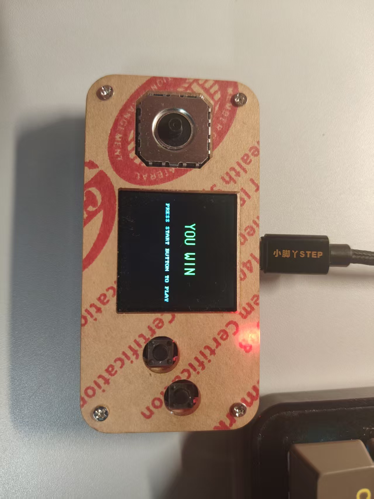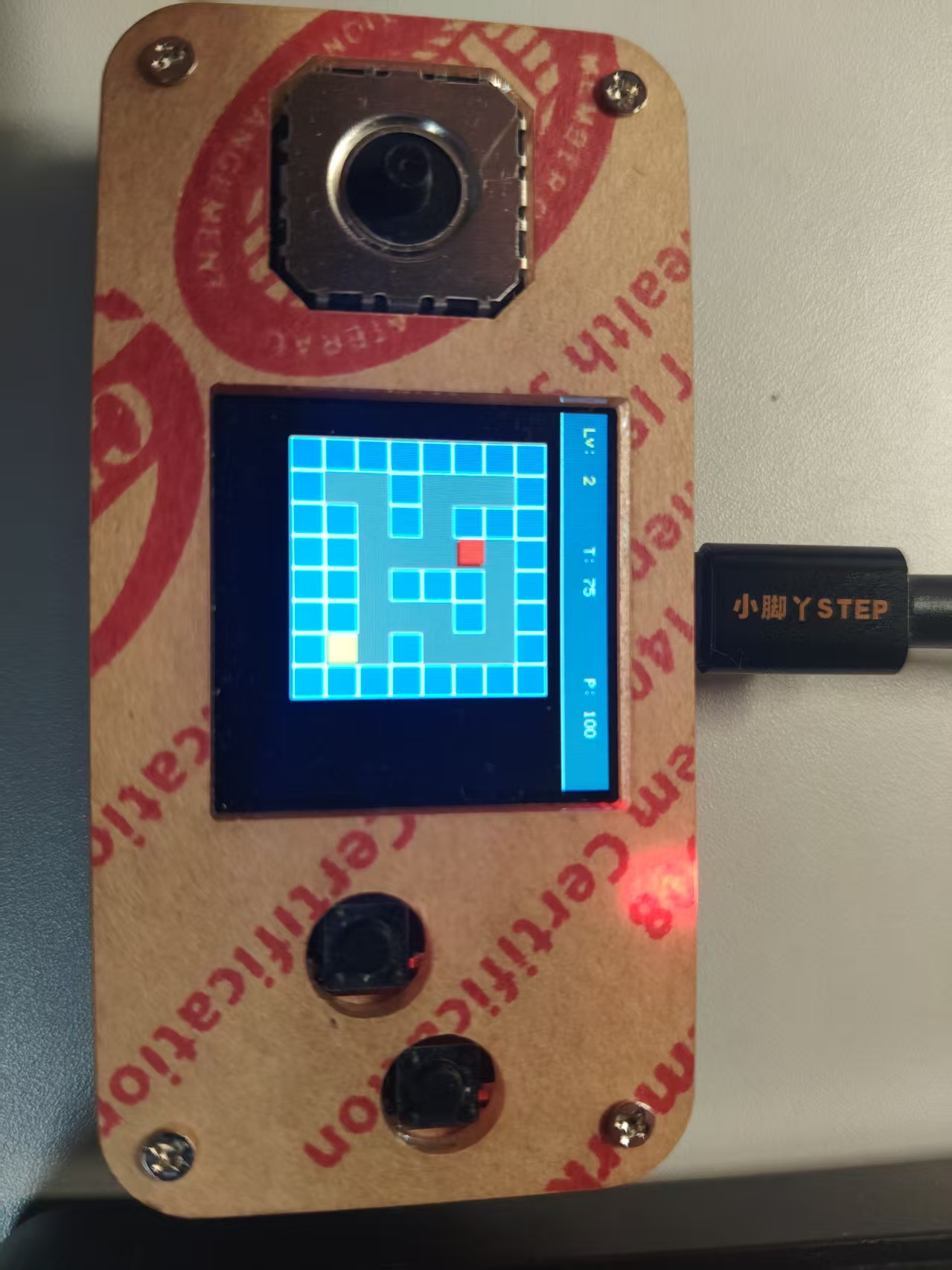 显示模块采用240×240 IPS彩屏(ST7789驱动),用于渲染游戏画面。输入系统包括四向摇杆、A/B/START/SELECT轻触按键,以及MMA7660三轴姿态传感器,共同实现方向控制、菜单操作与体感倾斜操控。音频反馈由PWM驱动的蜂鸣器提供,可发出碰撞提示与通关音效。此外,板载2MB Flash用于存储程序,并通过Type-C接口进行供电与程序下载。该硬件组合使开发者能专注于游戏逻辑与交互实现。