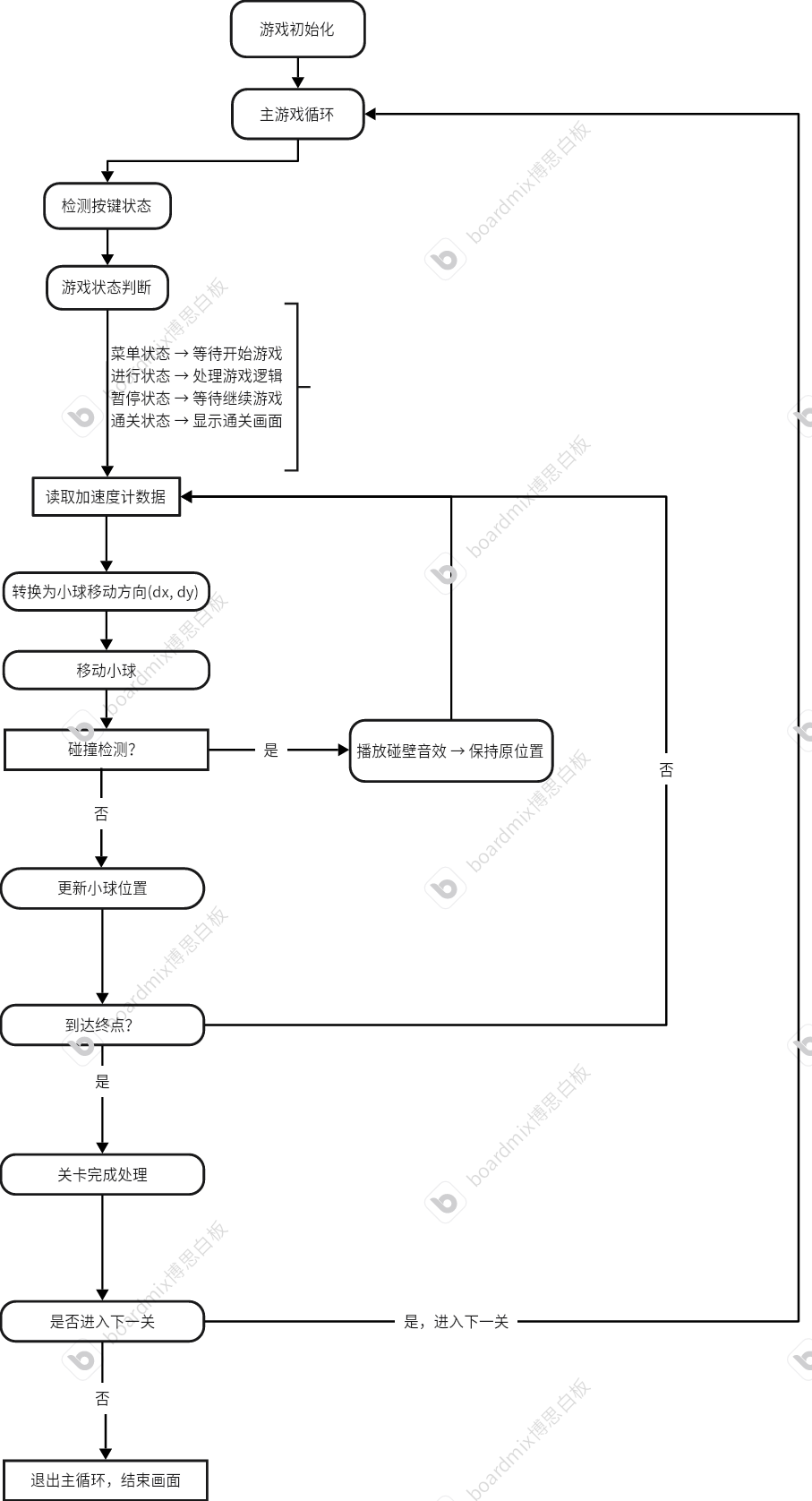 姿态传感模块:接收加速度计转换的dx, dy位移量,计算小球新位置并进行碰撞检测,处理通关判定,返回移动结果和状态标志。