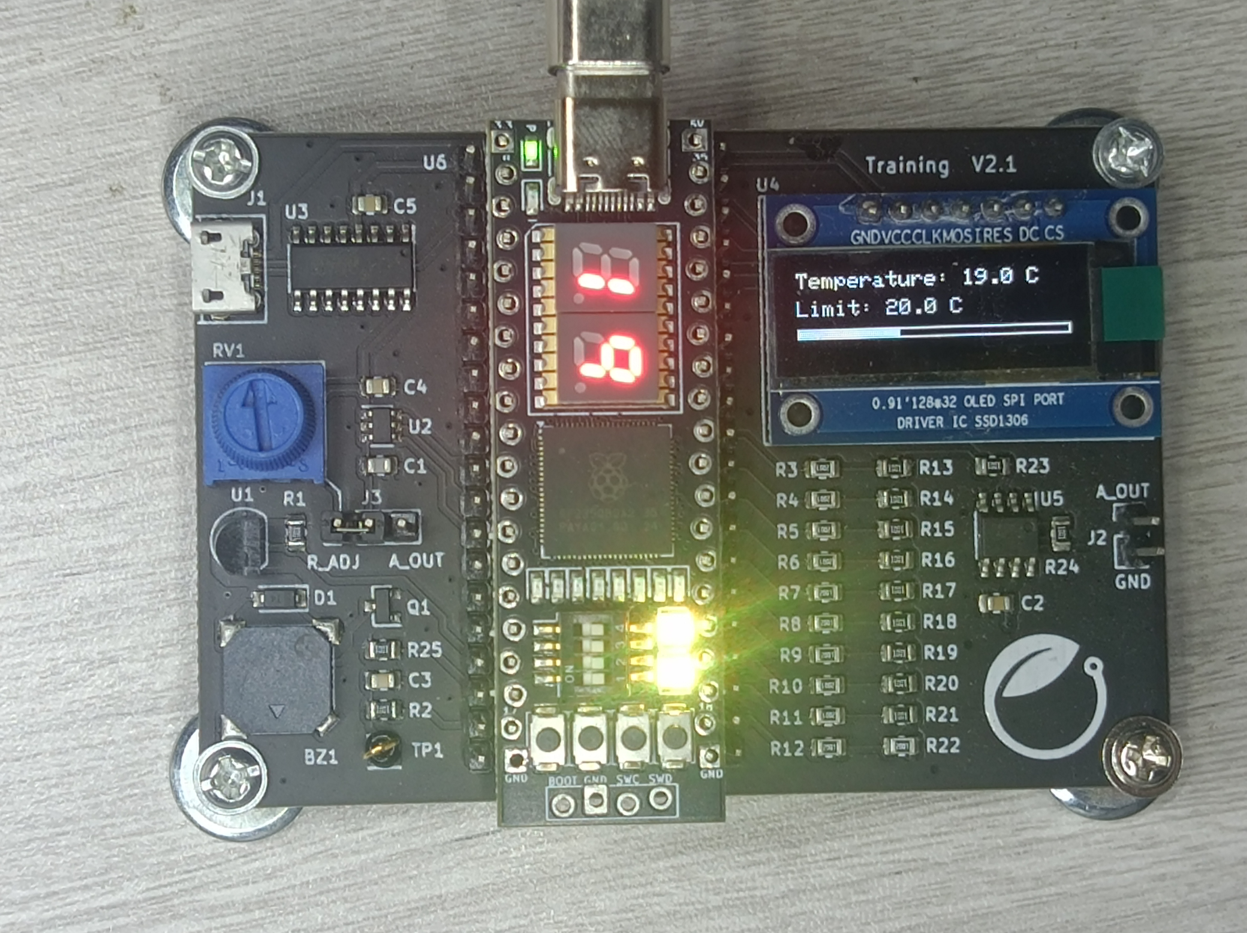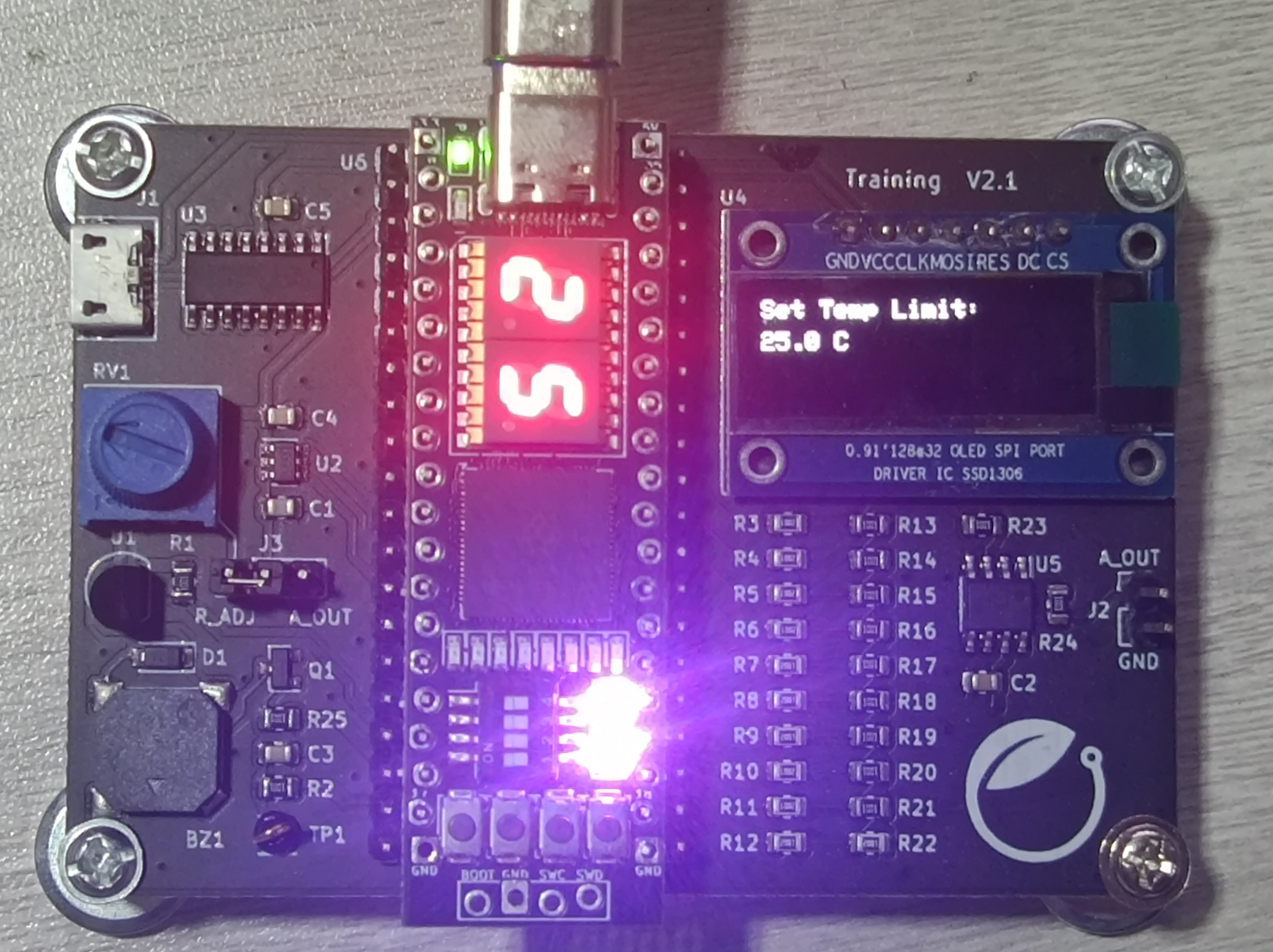 - 用户输入:板载轻触按键,用于设置温度报警上限。