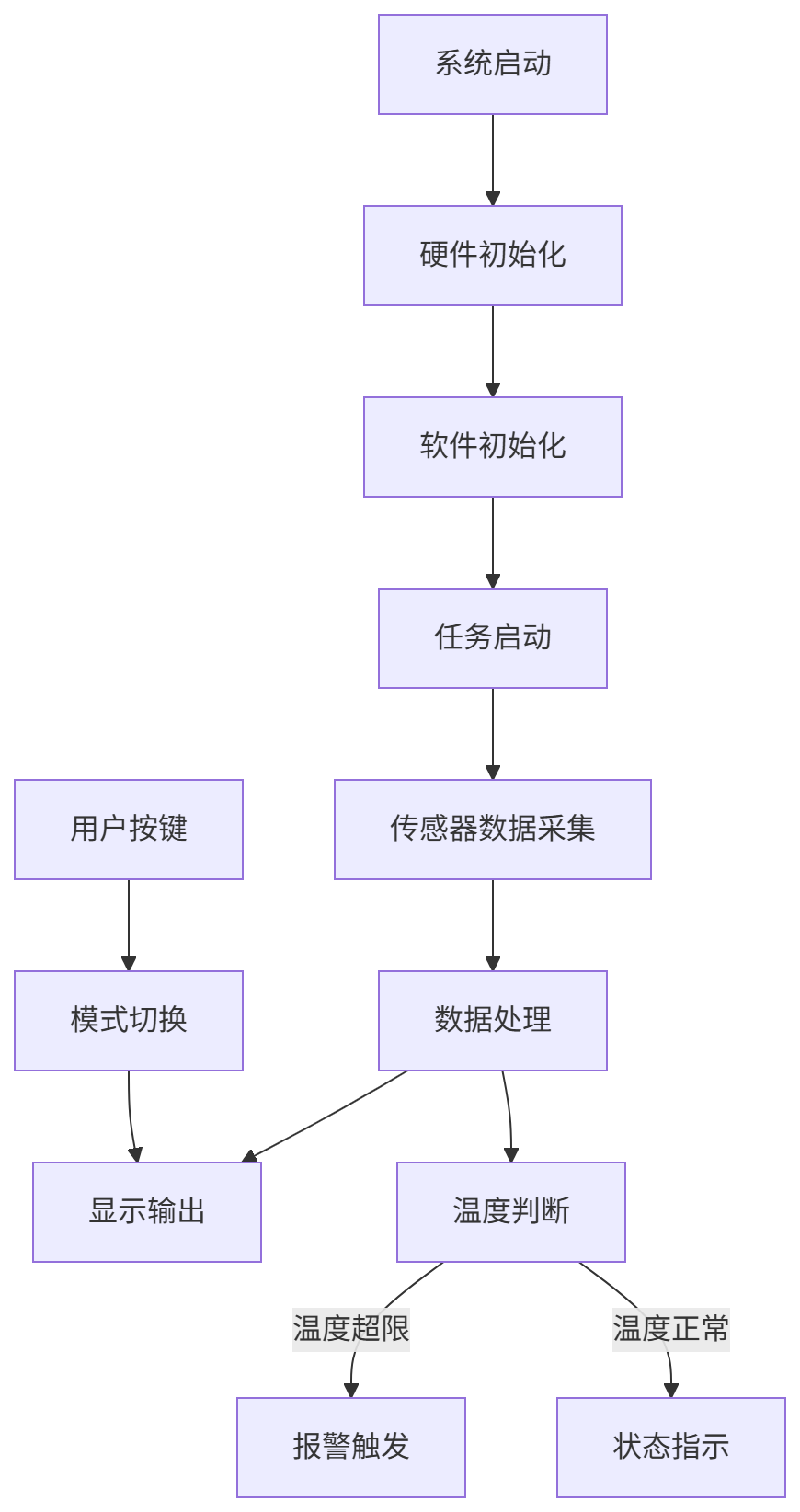 系统软件流程围绕初始化、数据采集、显示刷新及告警判断展开。主循环采用非阻塞式设计,确保各任务实时响应。