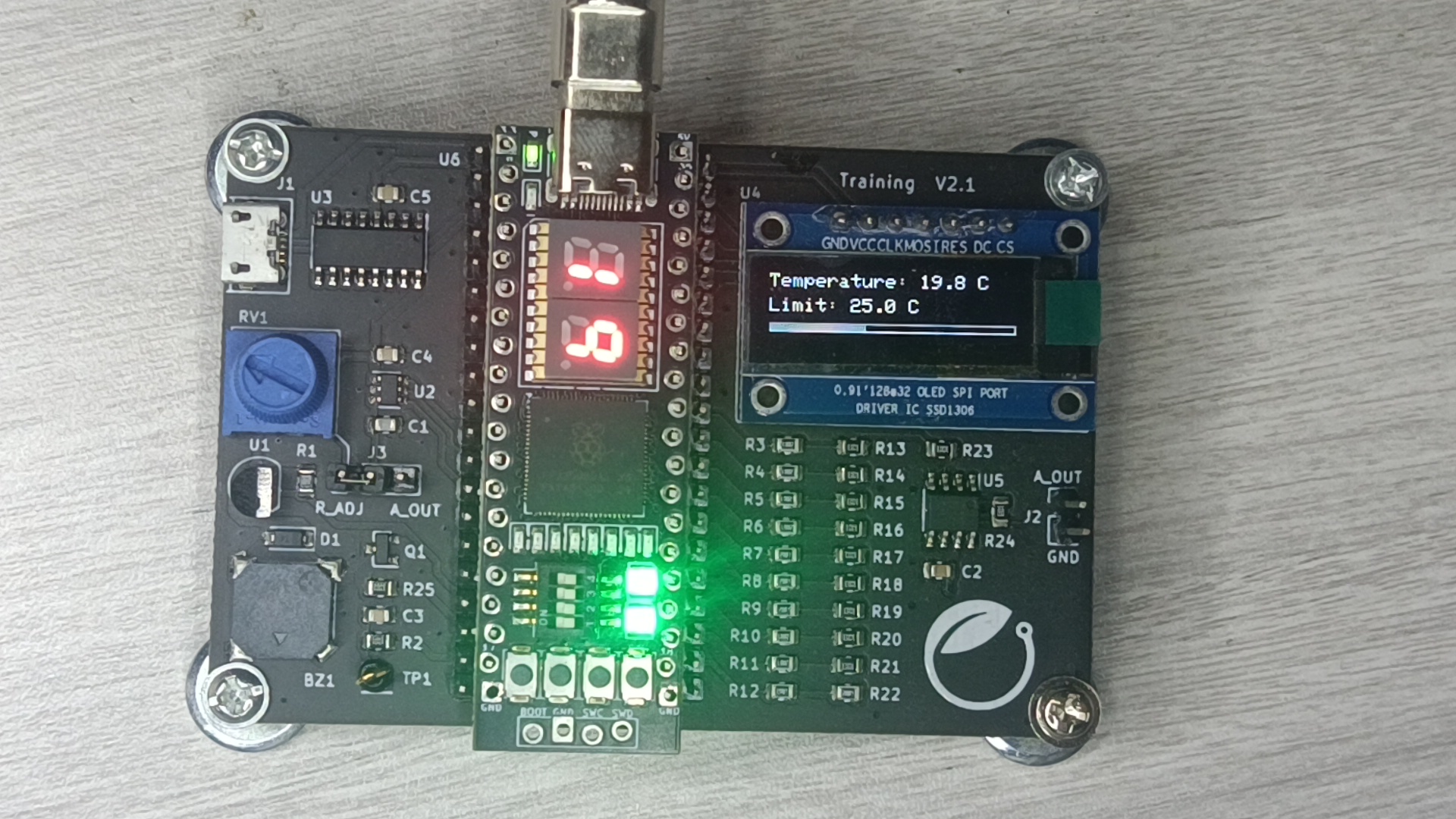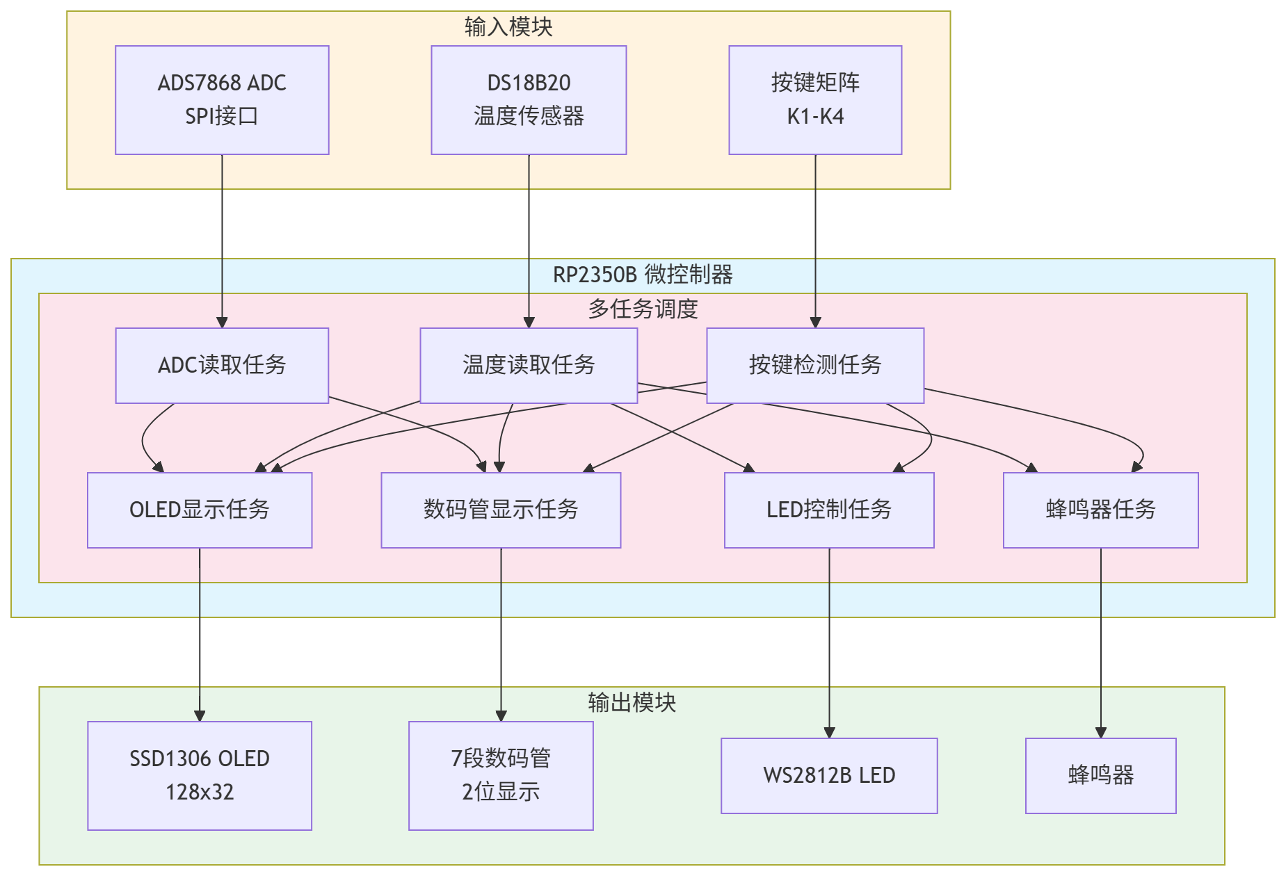 本项目基于 RP2350B 成功实现了一款集测量、显示、报警于一体的嵌入式仪表。项目充分利用了 RP2350B 的增强型 IO 能力,通过 SPI 驱动 OLED、通过 74HC595 驱动数码管,并融合了 DS18B20 与 ADC 的数据采集。