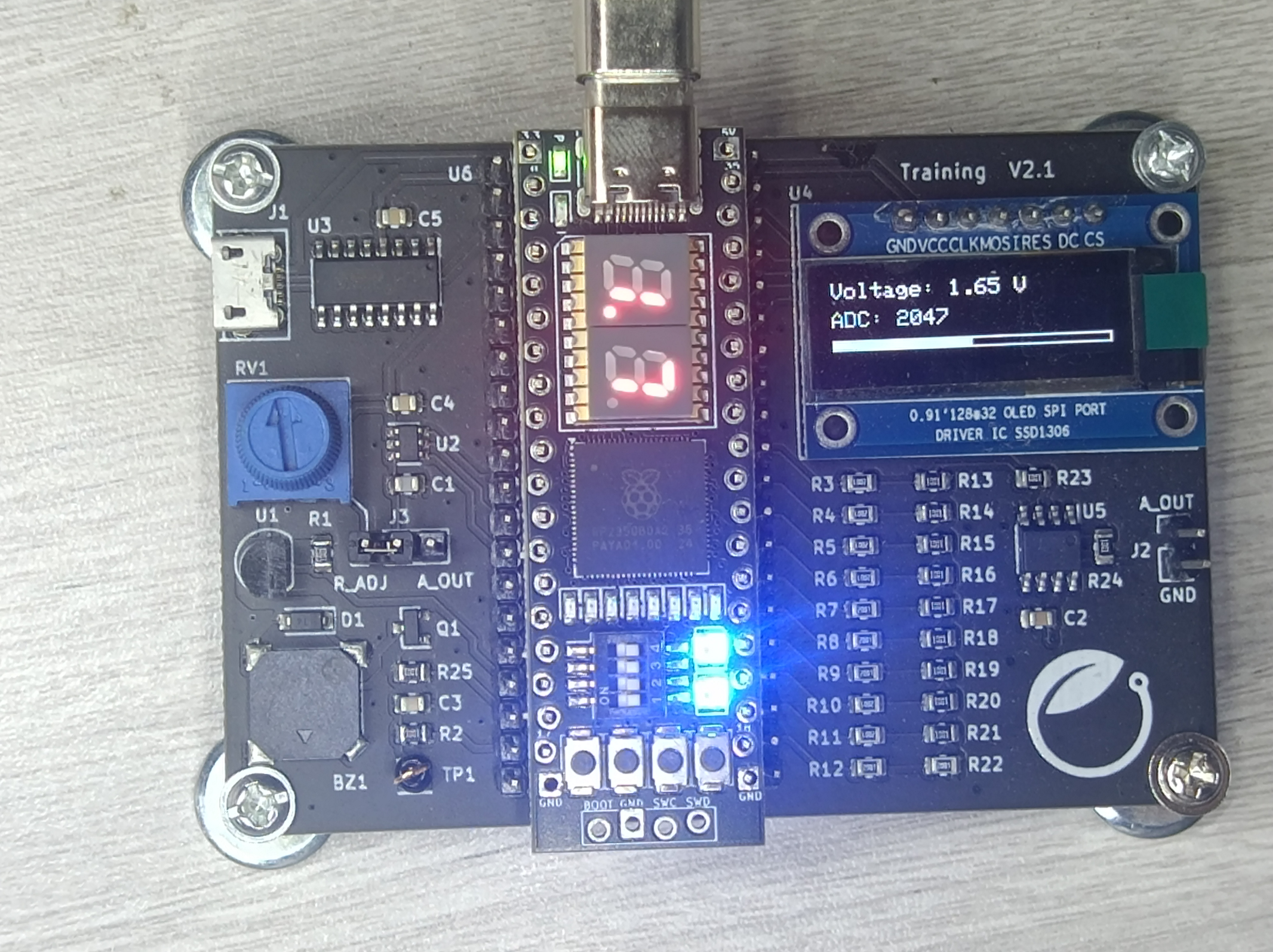 - 电压采集:板载电位计(电位器)连接至SPI接口的串行ADC,用于模拟电压信号的精确采集。