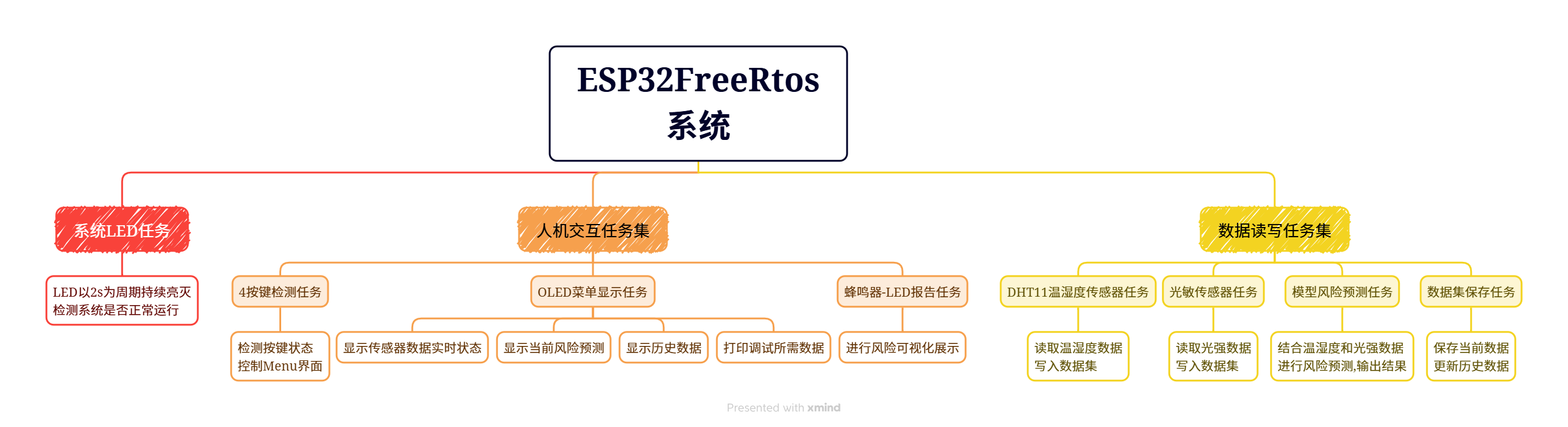 本项目基于ESP32+FreeRTOS实时操作系统构建一个环境监测与风险预测系统。系统通过温湿度传感器和光敏传感器采集环境数据,并利用嵌入式AI模型进行风险预测,同时通过OLED、RGB_LED和蜂鸣器进行信息显示和报警提示。