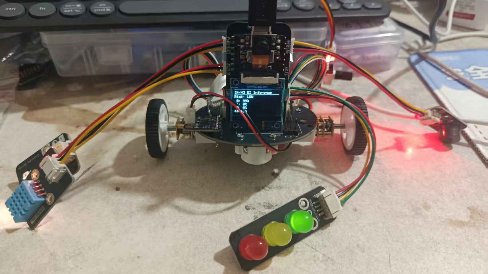 - OLED上显示各传感器实时值、预测评分与趋势、过往采集数据等,三色LED用红黄绿显示风险等级。