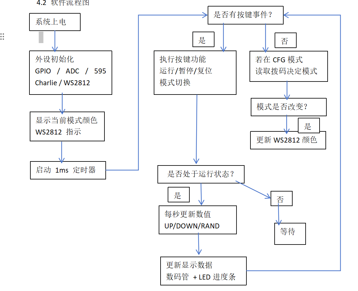 在1ms定时器中完成数码管动态刷新与进度条扫描,同时每5ms对ADC输入进行采样,实现按键消抖与拨码累积。主循环负责处理按键事件、模式切换以及计时逻辑,从而保证显示稳定与响应可靠。