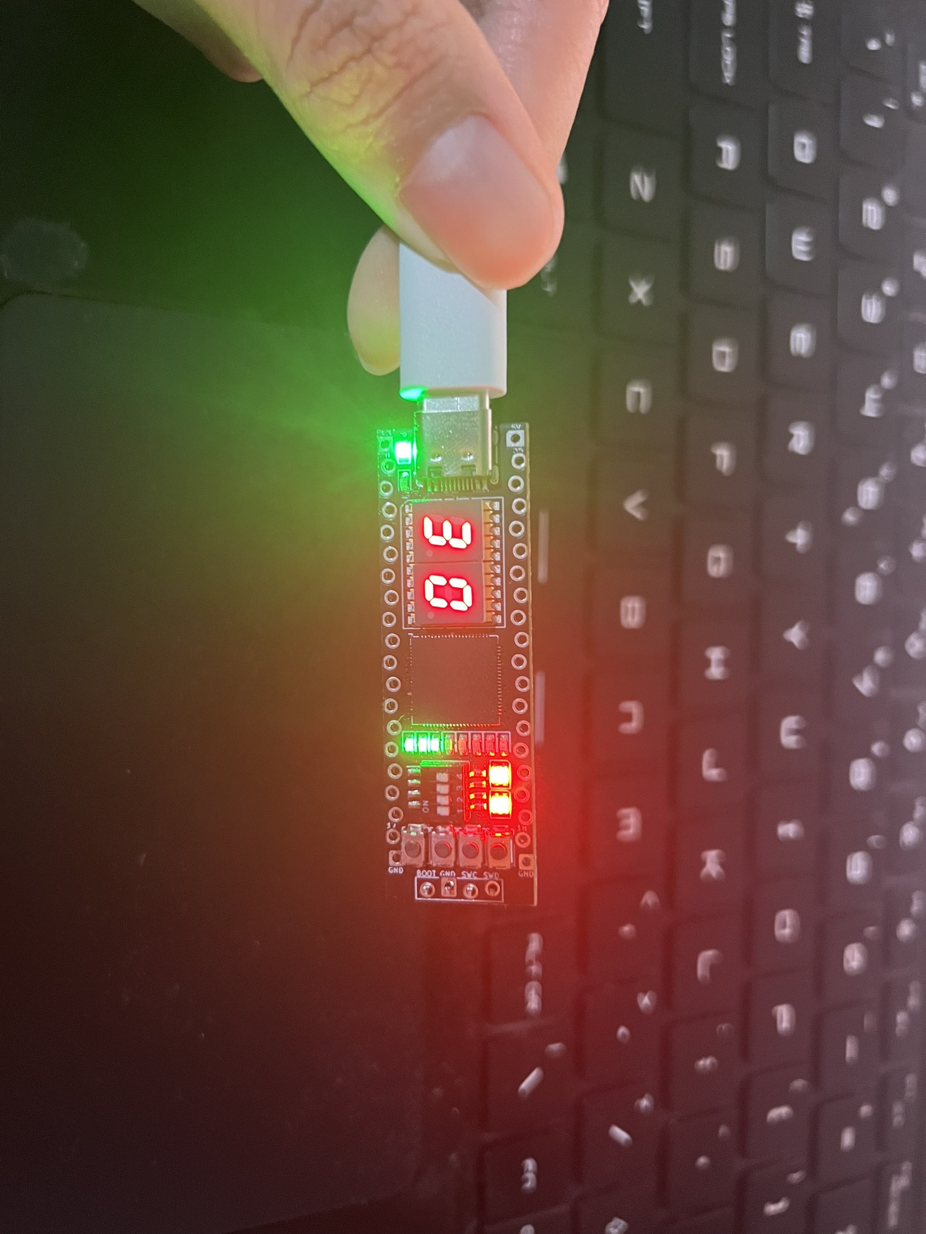 本次使用的板件是以树莓派rp2350为核心,具有48个io引脚,可以实现多种控制功能,板子上还配备了四个按键、四个拨码开关,2个ws2812rgb灯,8个led灯,两个7段数码管,一个姿态传感器。板件通过短接BOOT和gnd进入bootsel模式,在电脑上拖入.uf2文件实现烧录。