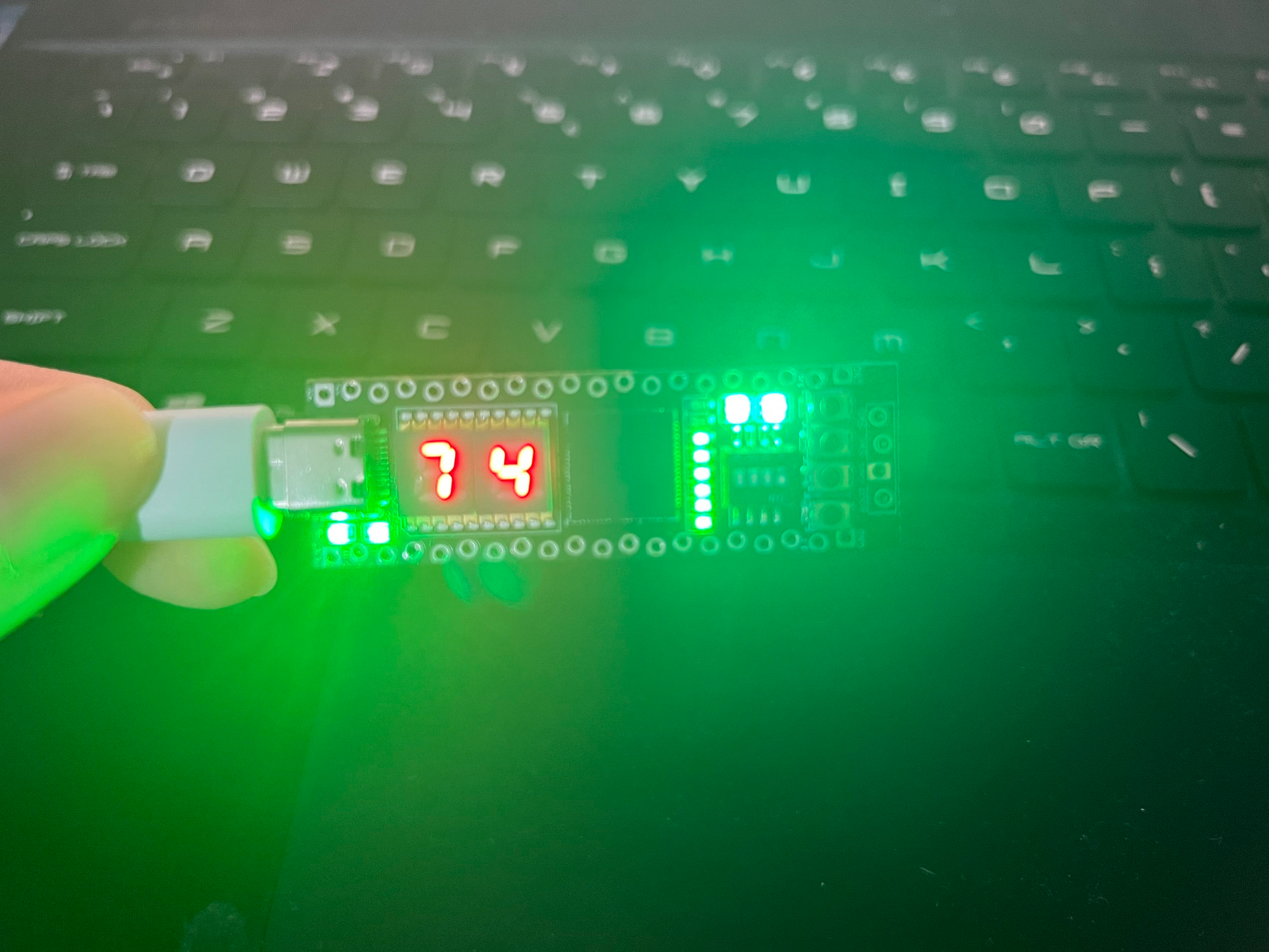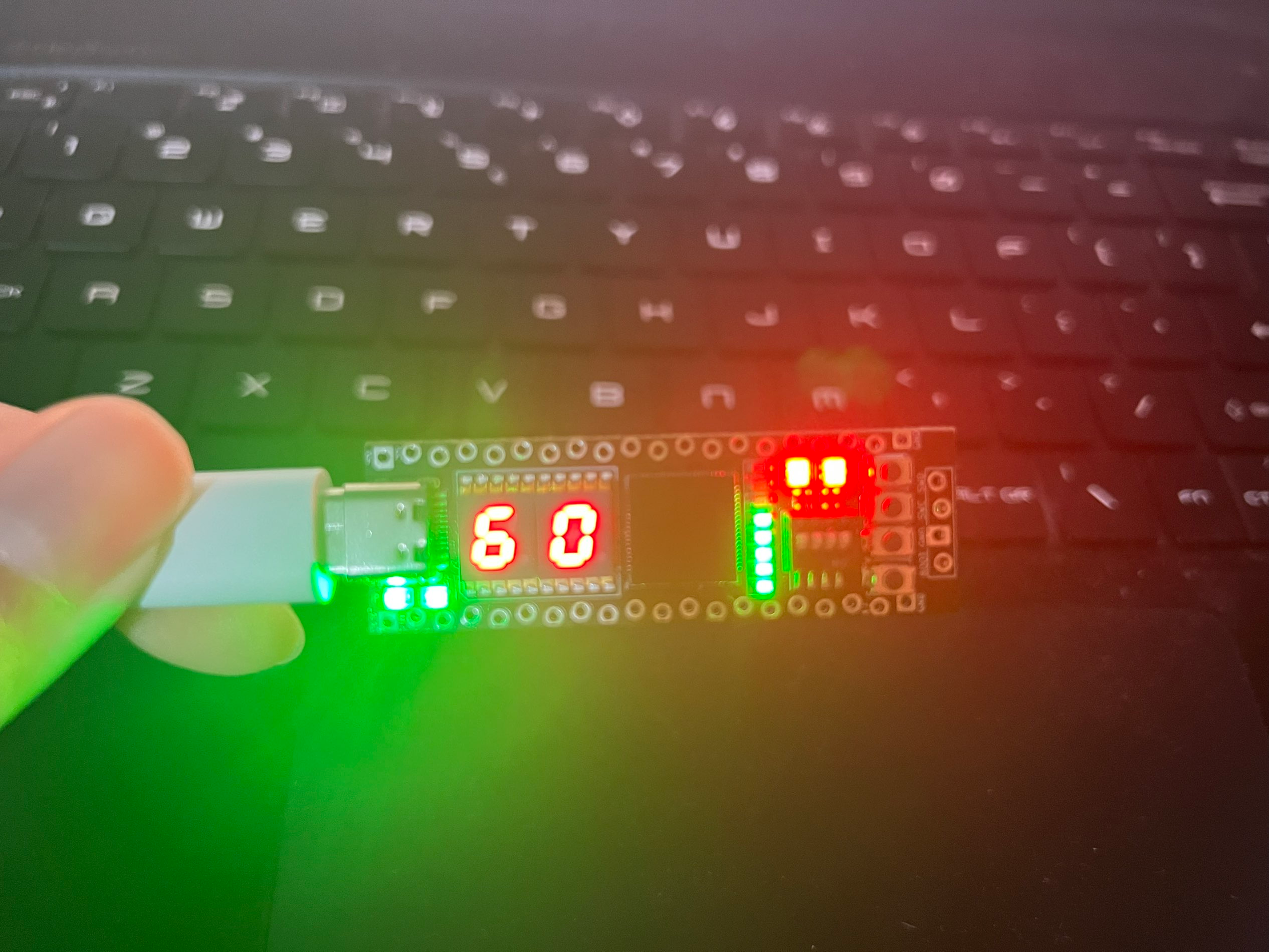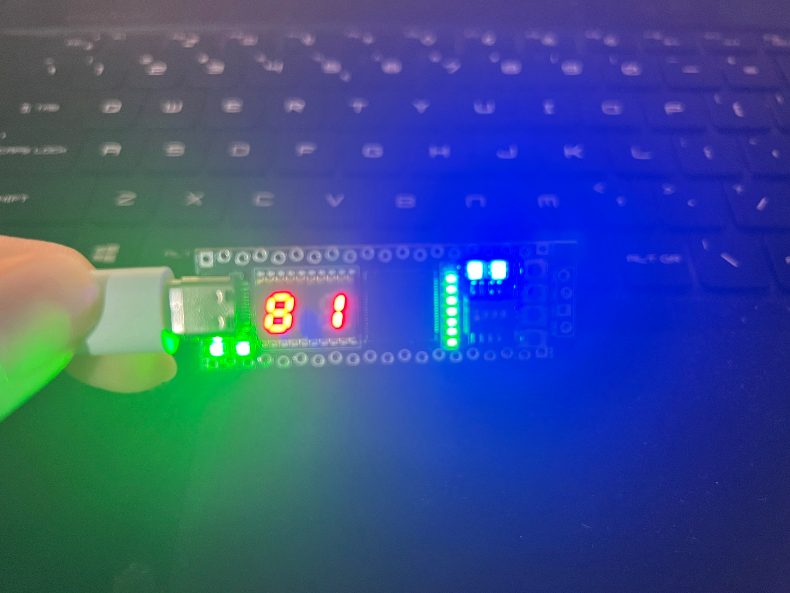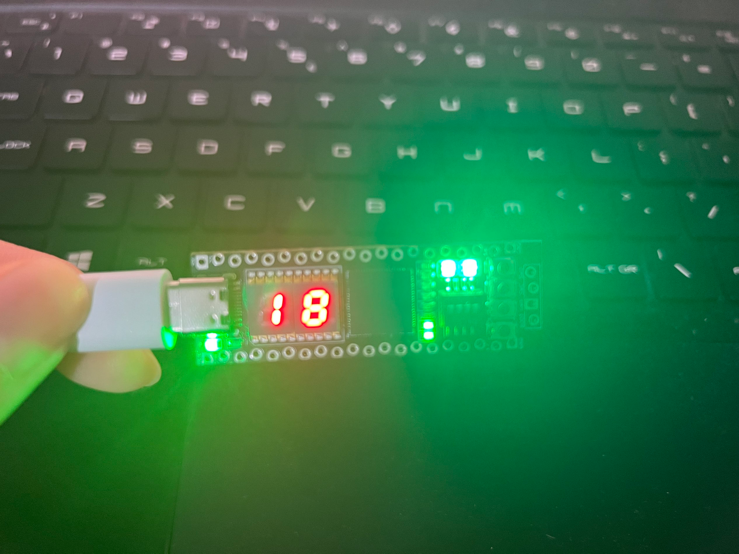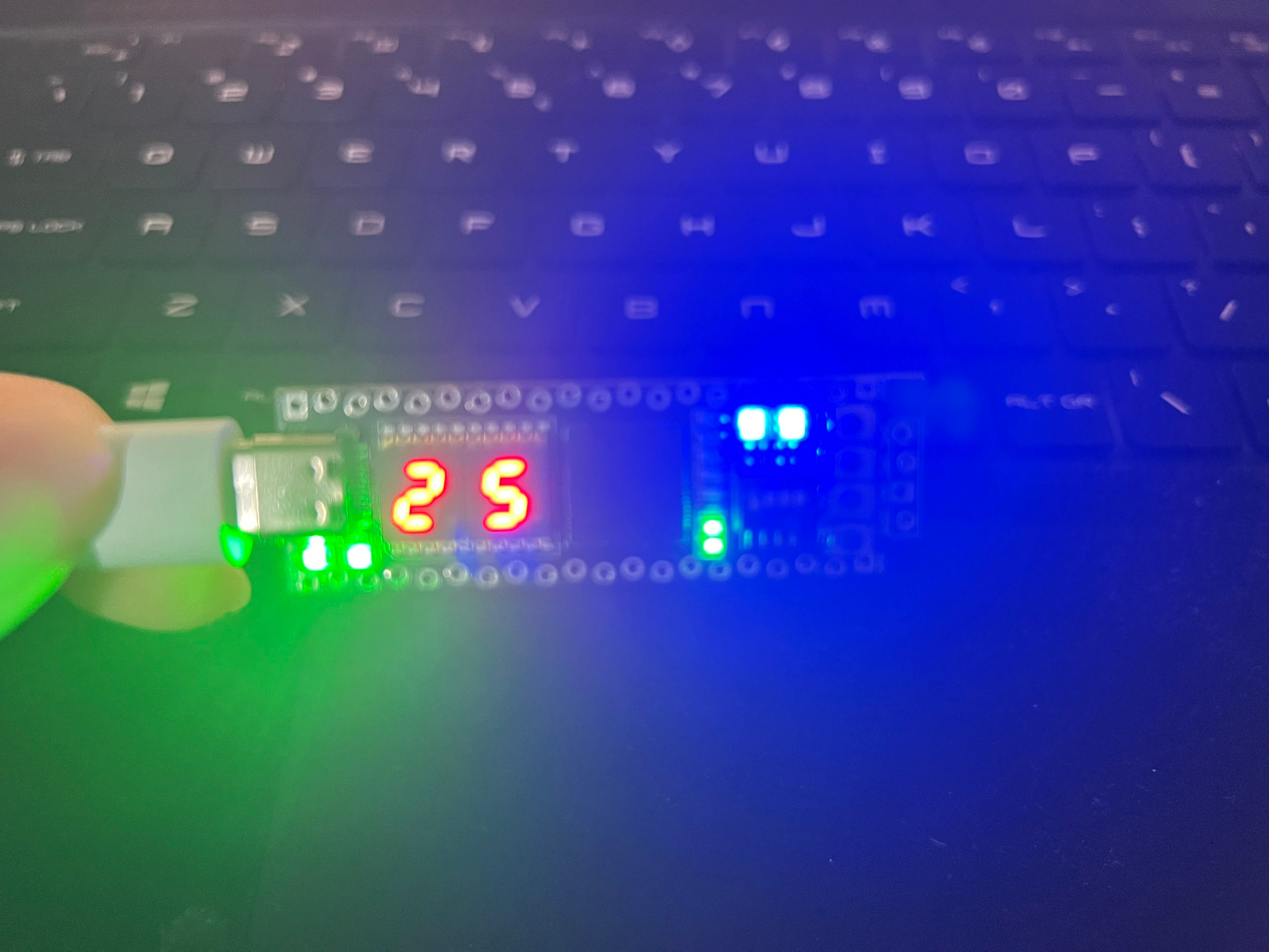 项目要求的三种功能:正计时、倒计时、随机数,两颗ws2812 RGB灯分别显示为绿色、红色和蓝色。进入拨码开关选择模式和初次上电时,显示为白色。