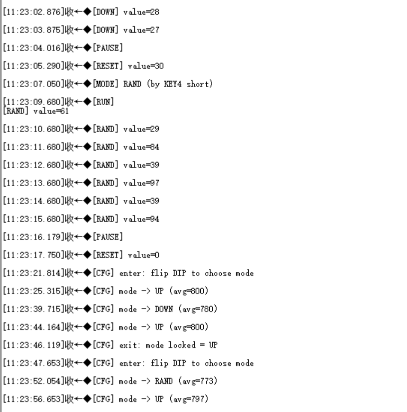 所有输出和模式切换均在usb串口输出,可以打开串口助手查看当前模式和当前数码管显示的数字。
