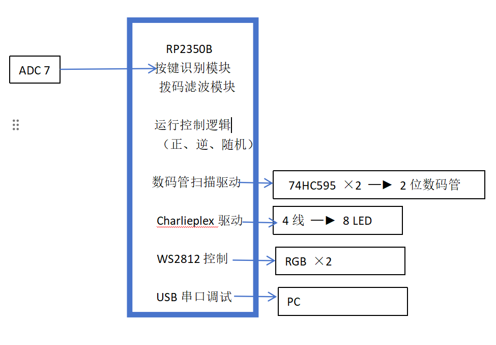 我选择的任务是基于RP2350B核心板LED与数码管多功能计时器,该项目的要求是使用4个按键实现计时开始、暂停、清零与模式切换,要求按键消抖与长按短按区分。通过4个拨码开关选择三种工作模式:正计时、倒计时、计次随机数显示。双位七段数码管(74HC595驱动)显示当前数值,8颗单色LED显示进度条,2颗WS2812显示当前模式颜色。并通过USB虚拟串口输出模式切换与数值变化日志。