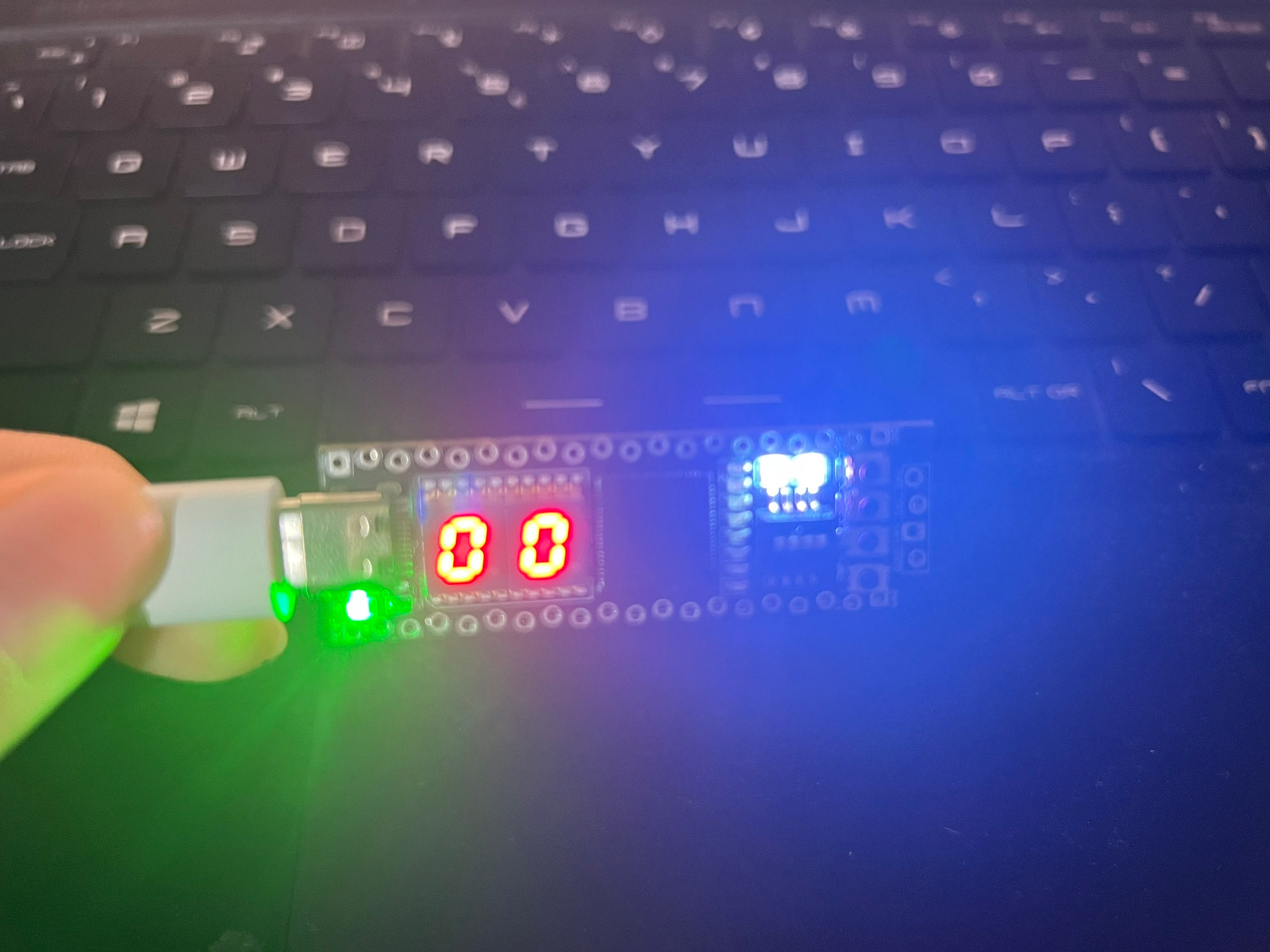 随机数模式时,rgb灯显示为蓝色,两个数码管随机生成0-99的数字