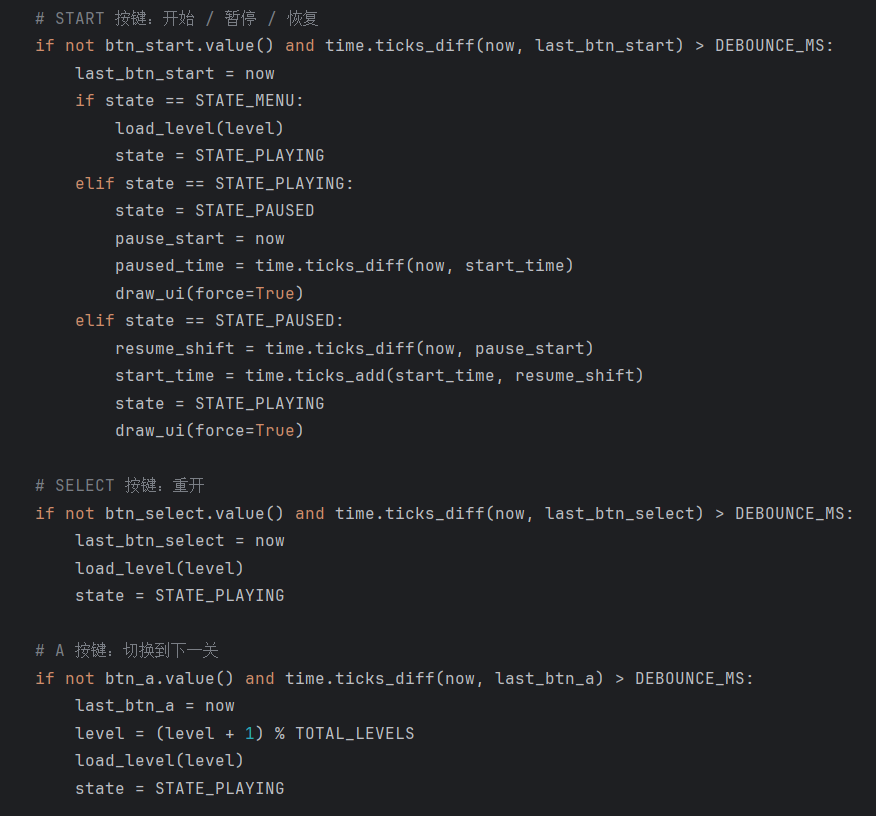 1.状态机设计:STATE_MENU / STATE_PLAYING / STATE_PAUSED三态,按键触发状态切换。