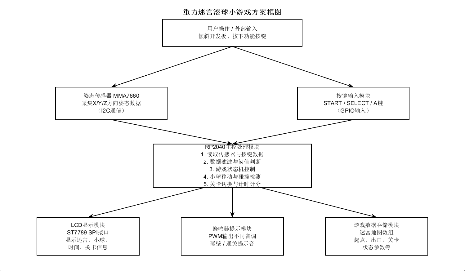这次寒假我参加了硬禾学习平台“电子森林”活动,我选择的项目是“RP2040游戏机”方向下的重力迷宫滚球小游戏。该项目聚焦于嵌入式系统的“输入—处理—输出”完整链路:通过姿态传感器(IMU)采集俯仰/横滚数据作为输入信号,经单片机处理后映射为游戏逻辑中的移动方向,再通过LCD实时显示迷宫、球的位置、计时与关卡信息,并通过蜂鸣器对碰壁、通关等事件做声音反馈。同时任务还要求加入按键交互,实现开始/暂停/重开/切关等功能,至少设计三关固定迷宫。