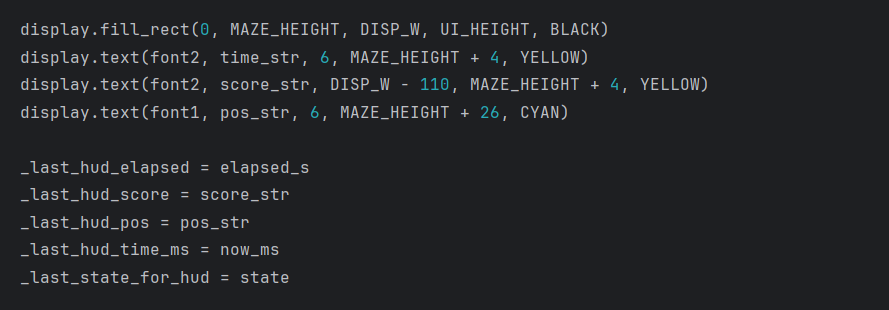 4.屏幕刷新优化:采用“局部擦除上一格+绘制新位置”的方式;HUD也采用缓存对比+时间间隔刷新,避免闪烁。