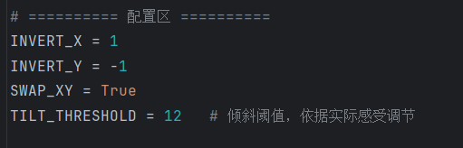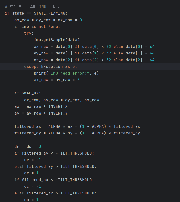 (2)解决:加入一阶低通滤波(ALPHA)对ax/ay平滑;同时引入TILT_THRESHOLD(倾斜阈值),只有超过阈值才移动。这样既稳定又保留灵敏度。