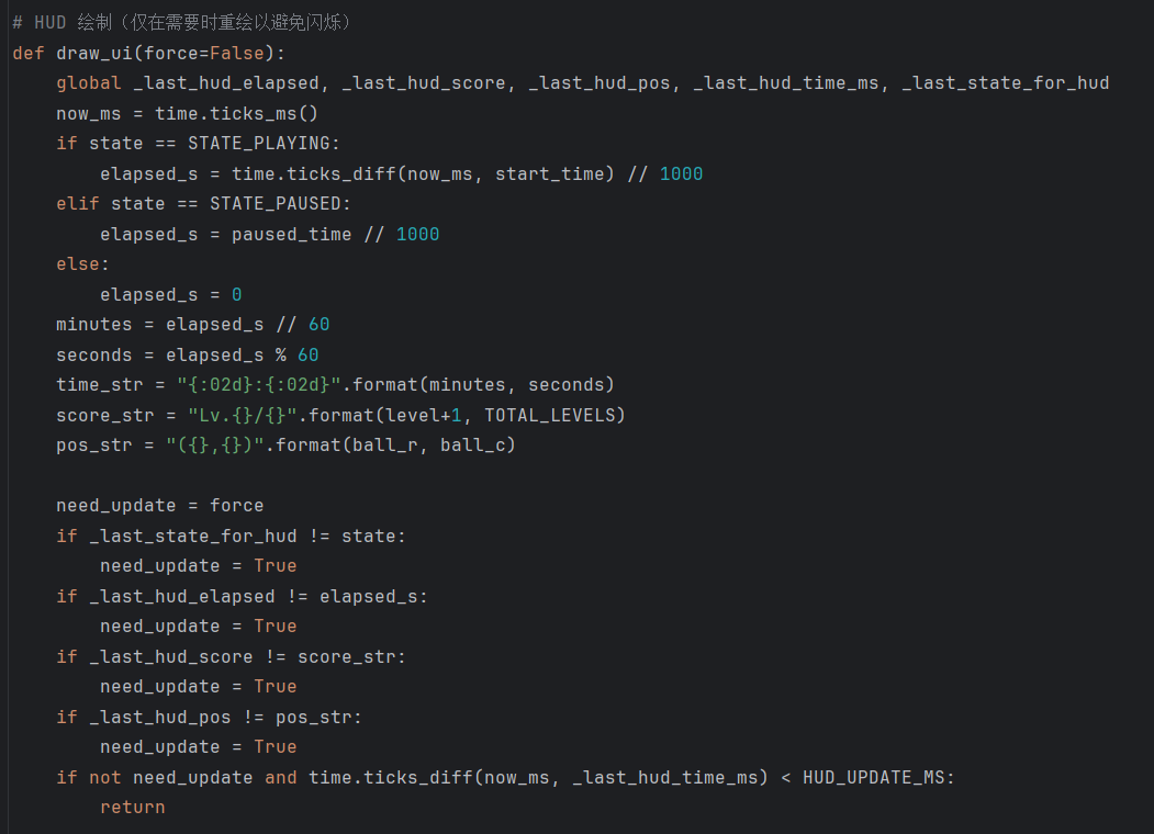 (2)解决:采用局部刷新策略:只重绘旧位置的背景格子,再绘制新位置的球;HUD也做缓存比较,只有时间/关卡/坐标变化时才刷新,并设置HUD_UPDATE_MS。体验明显提升。