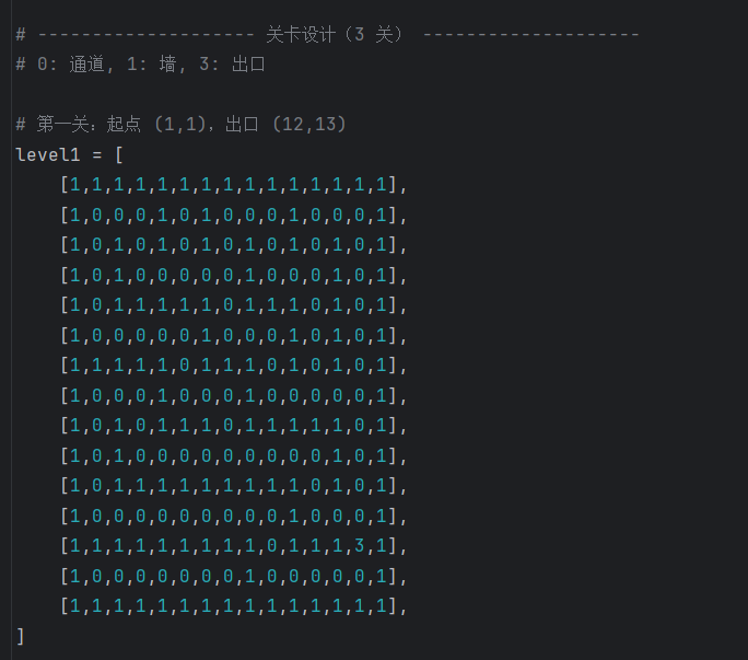 2.迷宫数据结构:每关一个15×15二维数组,0表示路,1表示墙,3表示出口;起点单独配置,加载关卡时统一重置。这样的数据驱动方式便于扩展更多关卡。