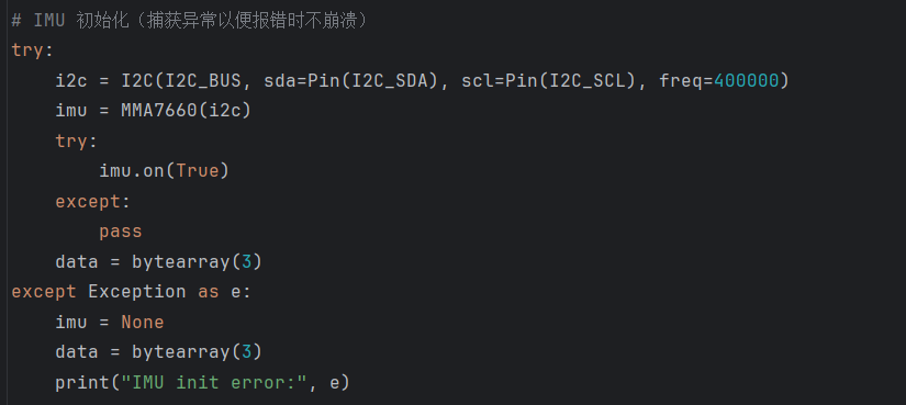 5.异常保护:IMU初始化与读取都try/except,确保硬件偶发异常时程序仍可运行,最多失去重力控制但不死机。