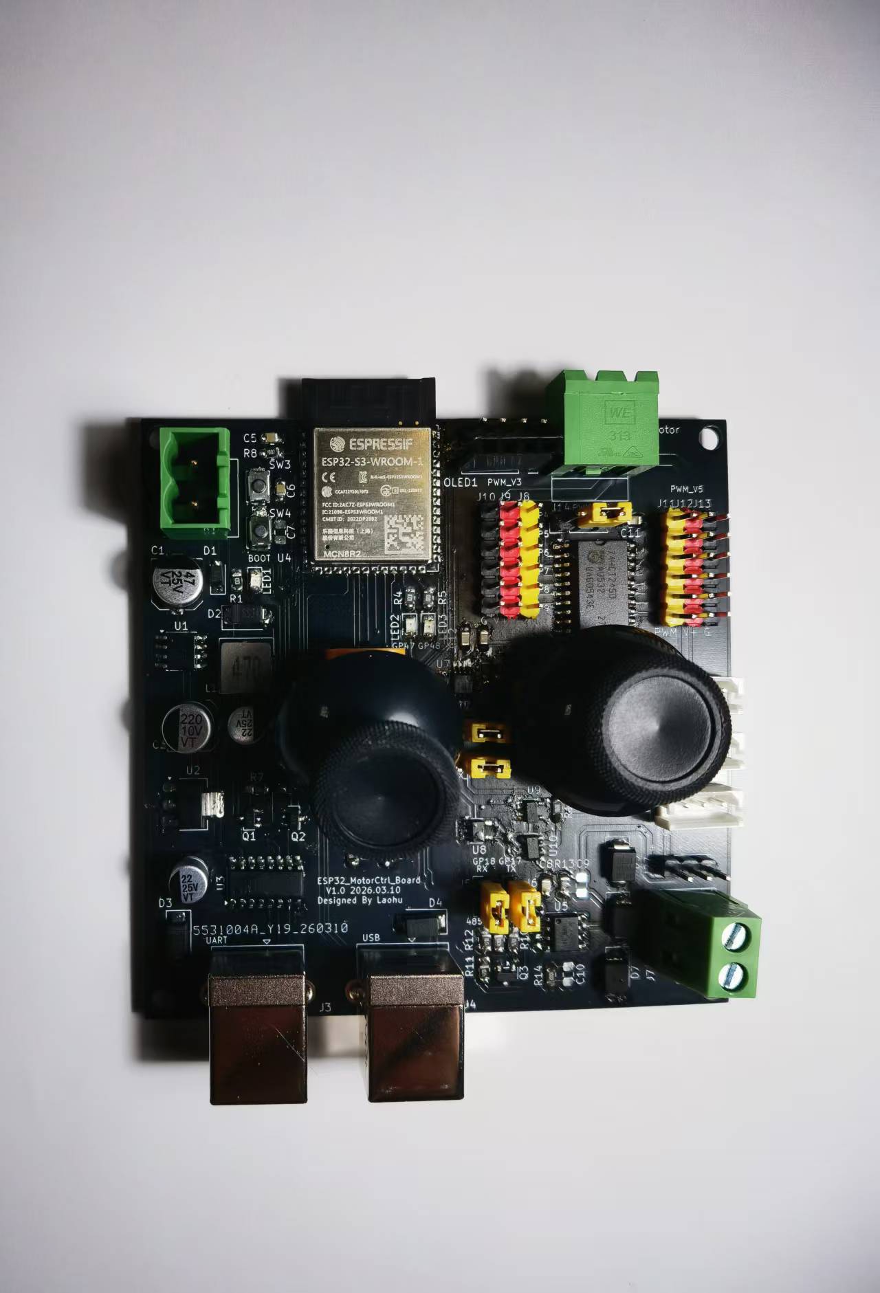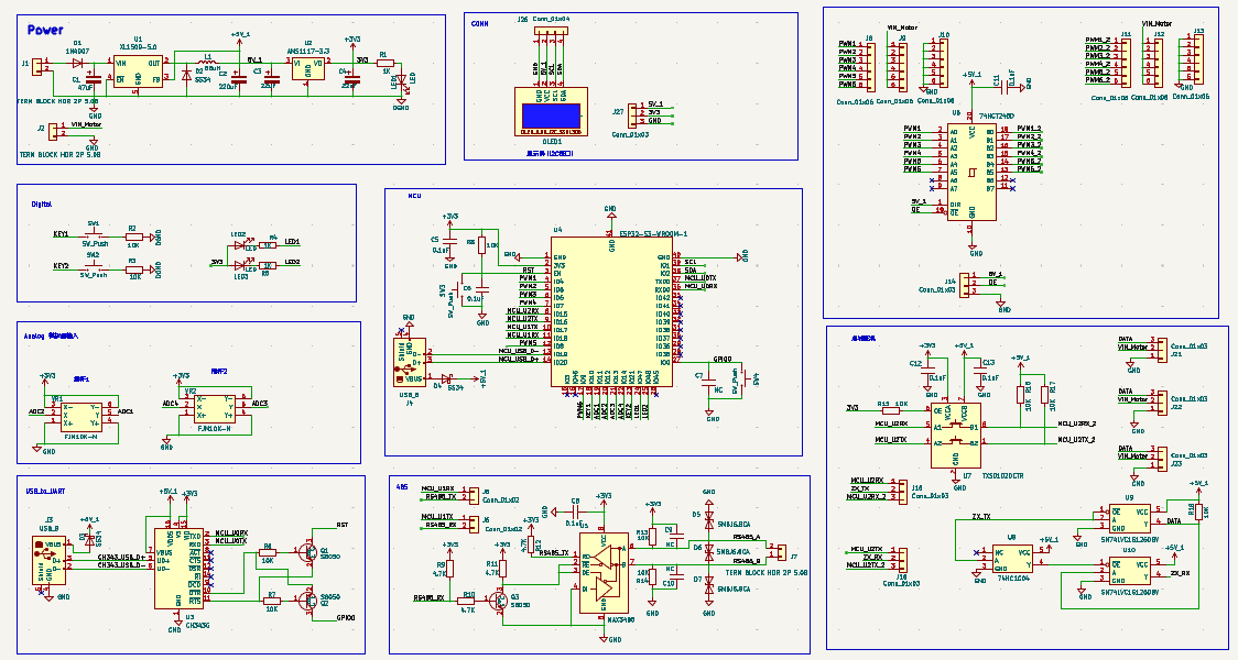 MCU使用乐鑫的ESP32-S3-WROOM-1模组。使用了GPIO、ADC、PWM、UART、I2C、USB等资源。