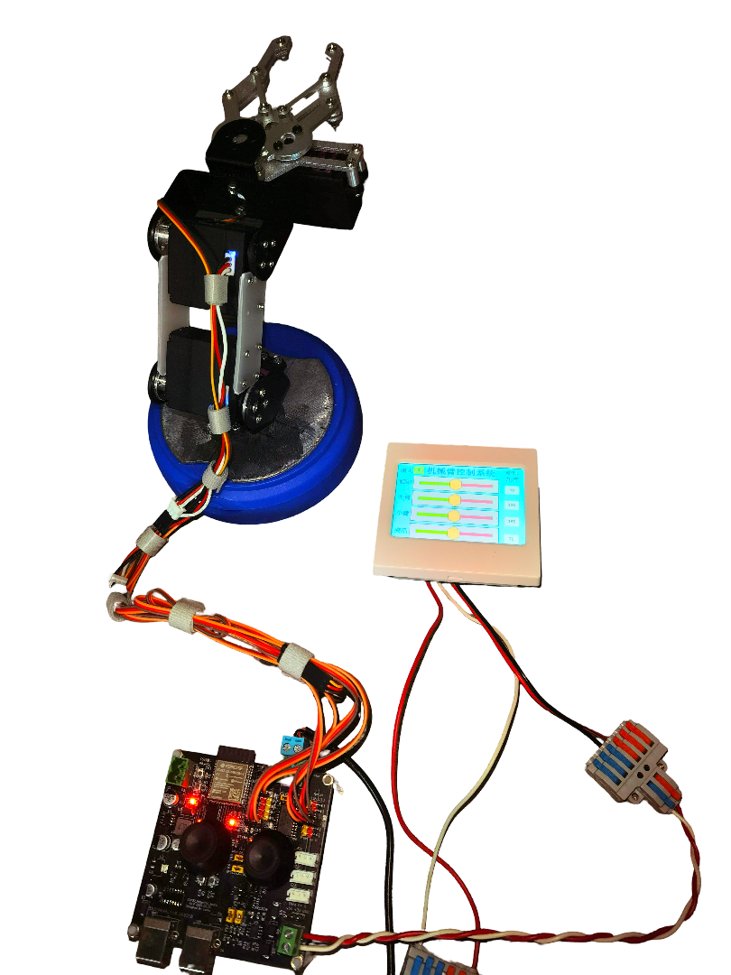为测试控制板功能,本人动手制作了一款4自由度机械臂,机械臂含有3个旋转关节和1个夹爪,命名为“小黑机械臂”。可通过操作控制板手柄或触摸屏485通讯接口控制各关节动作,实现手动或自动控制功能。