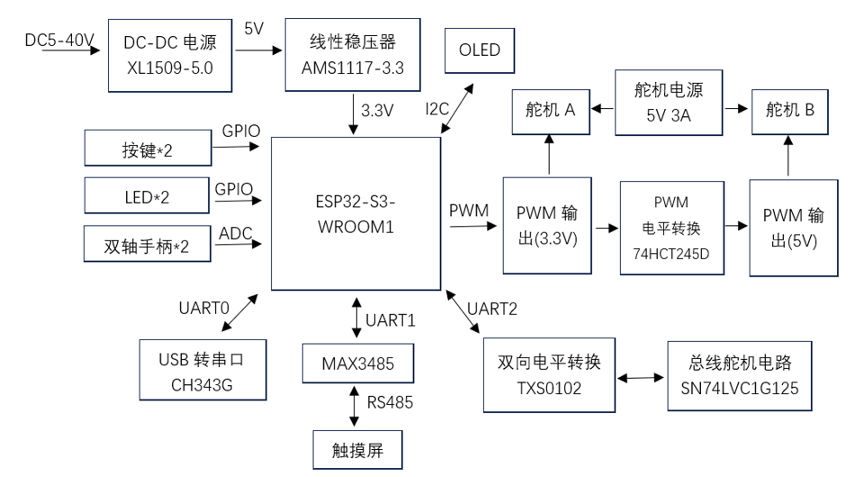 MG996R舵机支持3.3V和5V的PWM,而总线舵机只兼容5V的PWM,所以使用74HCT245D进行电平转换,将3.3V的PWM信号转成5V,以驱动总线舵机。