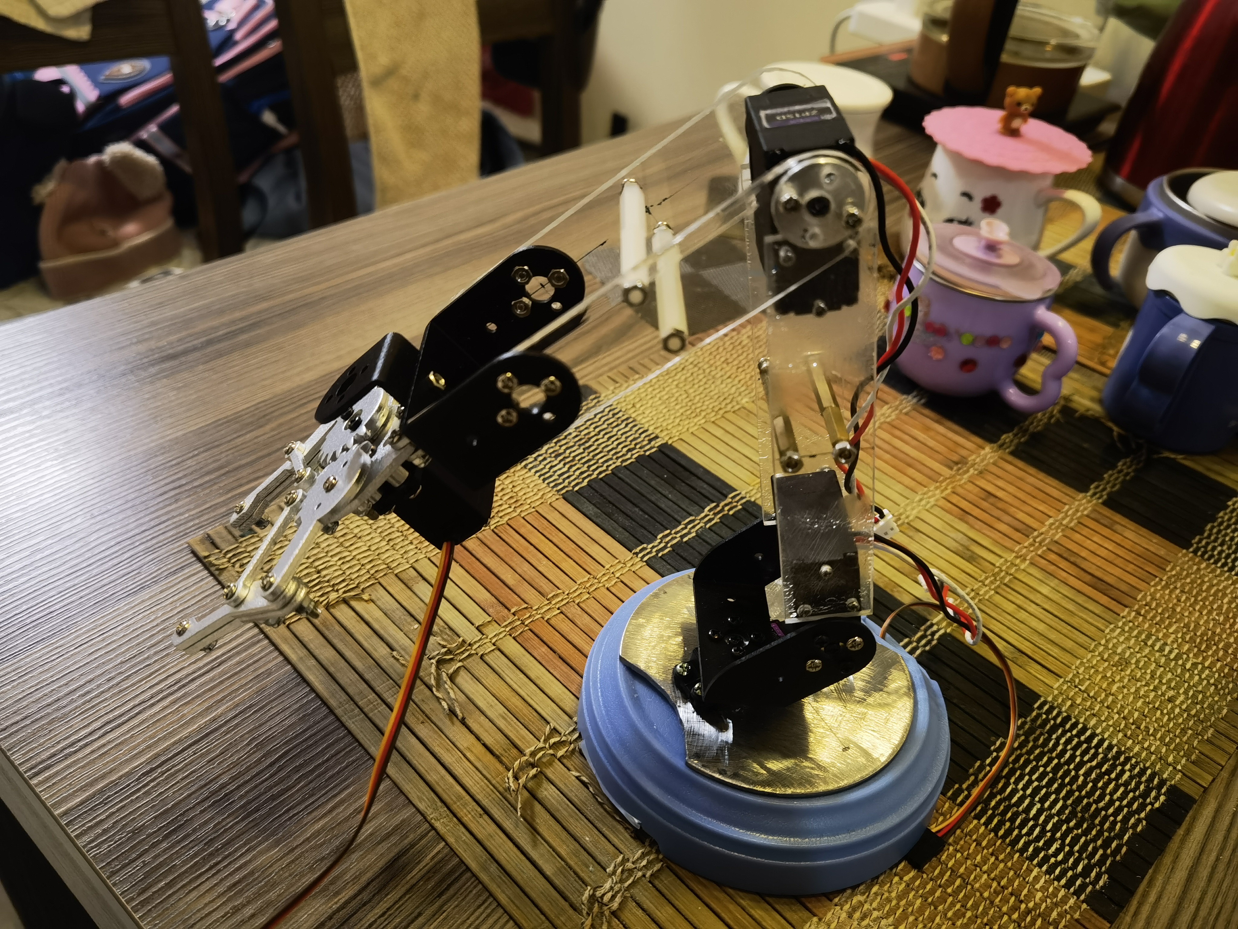 机械:目前只有4个自由度,不够灵活。机械结构靠散件拼搭,精度不够。后续考虑全新设计,3D打印。
