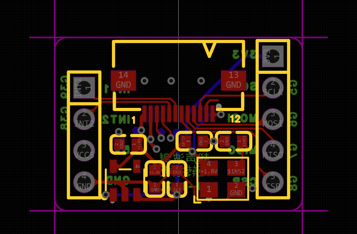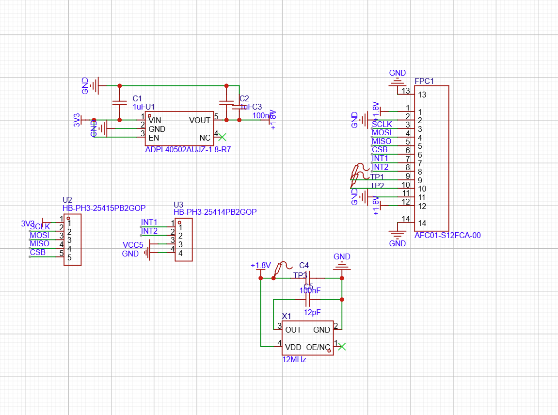参考着网上寻来的资料绘制好转接电路图。ICU-10201 超声波飞行时间传感器与主机通讯使用SPI总线。使用fpc座做接口,12P的,其中3、4管脚可以用来接一个外部晶振,但是还没看太明白是做什么用的。电路图设计上,先预留了这部分元器件,但是没有焊接,先留空。AtomS3开发板背面有6个GPIO输出,通过排针与转接板连接。