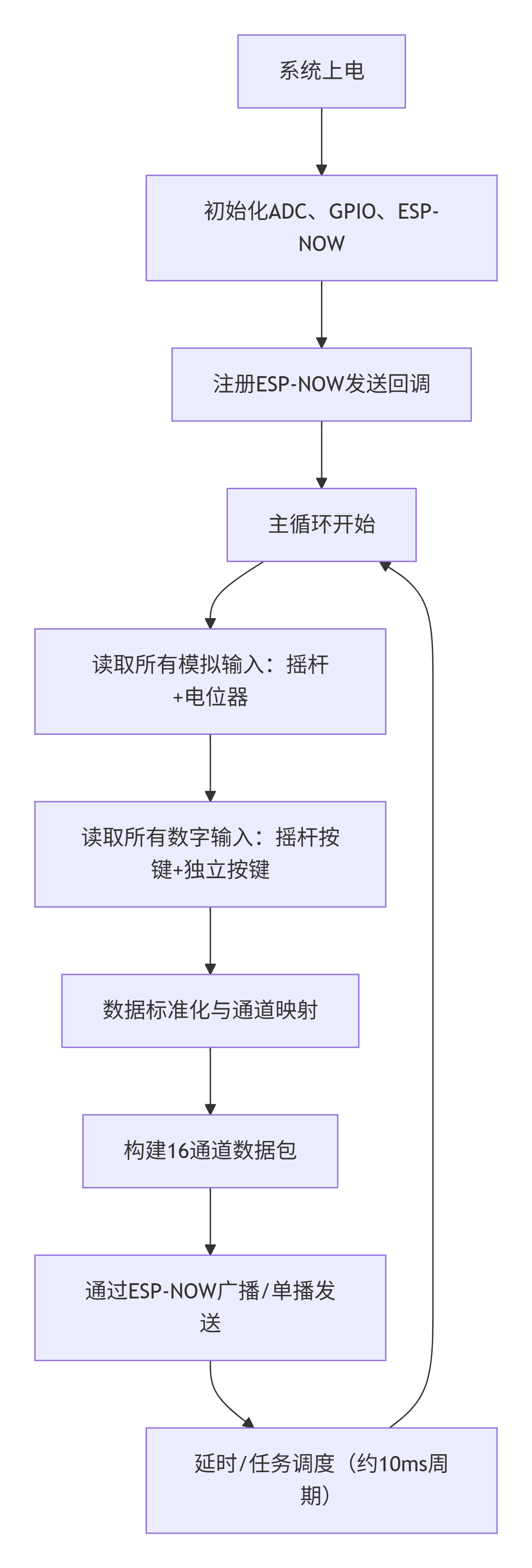 - 低延迟通信:ESP-NOW无需连接路由器,直接MAC层通信,延迟<10ms,适合实时遥控。