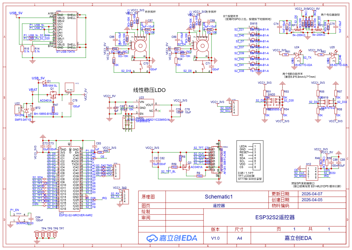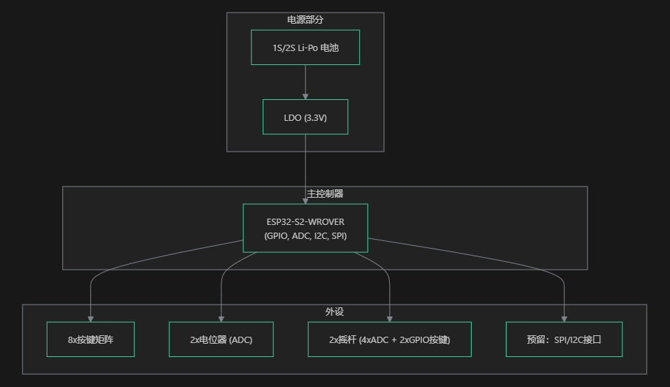 本遥控器硬件核心为 ESP32-S2-WROVER-N4R2 模组,其主要外围电路包括: