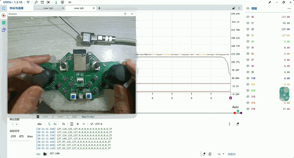 测试环境使用一块 Seeed Studio XIAO ESP32C3 开发板作为接收机,接收遥控器发送的 ESPNOW 数据包并通过串口发送至上位机,上位机以图形方式展示各通道的数值。