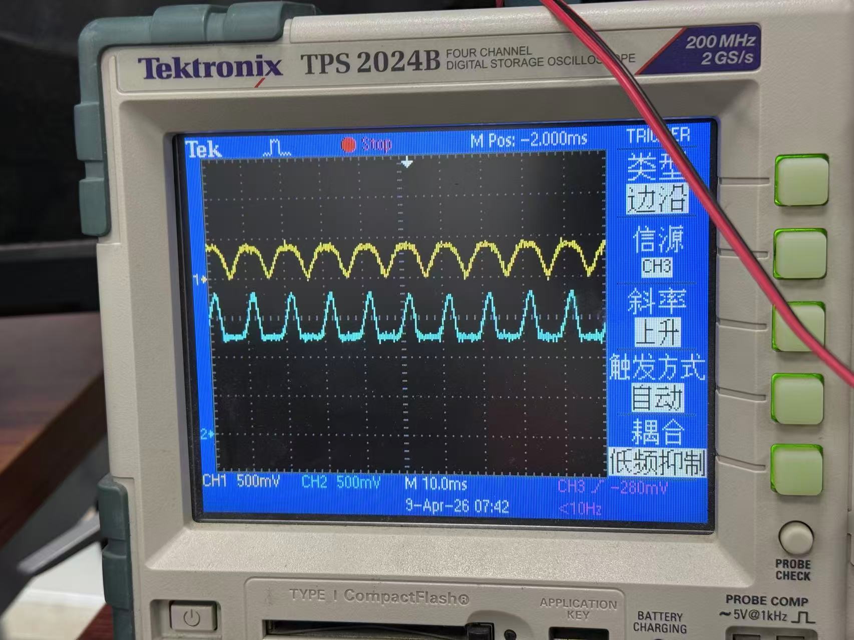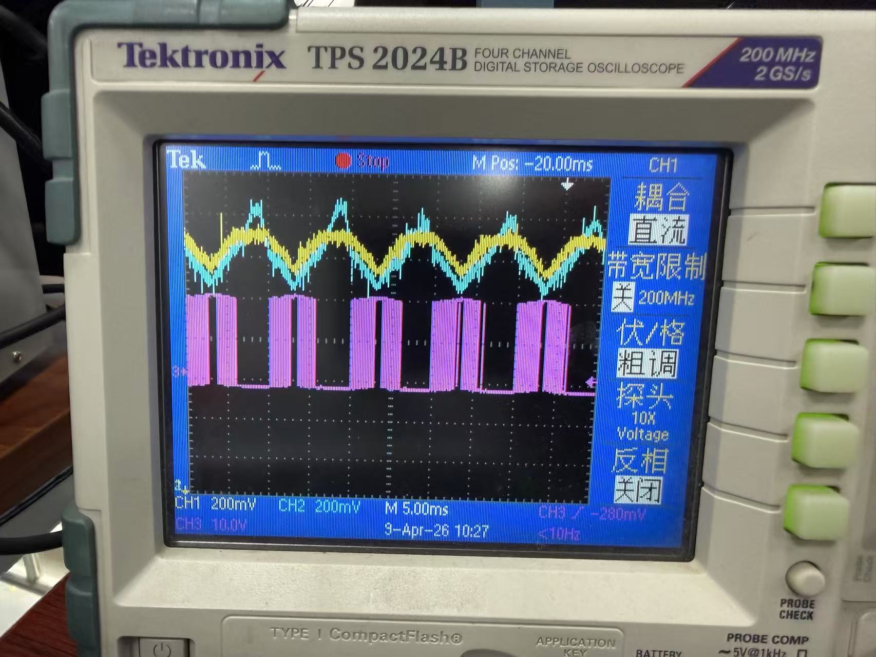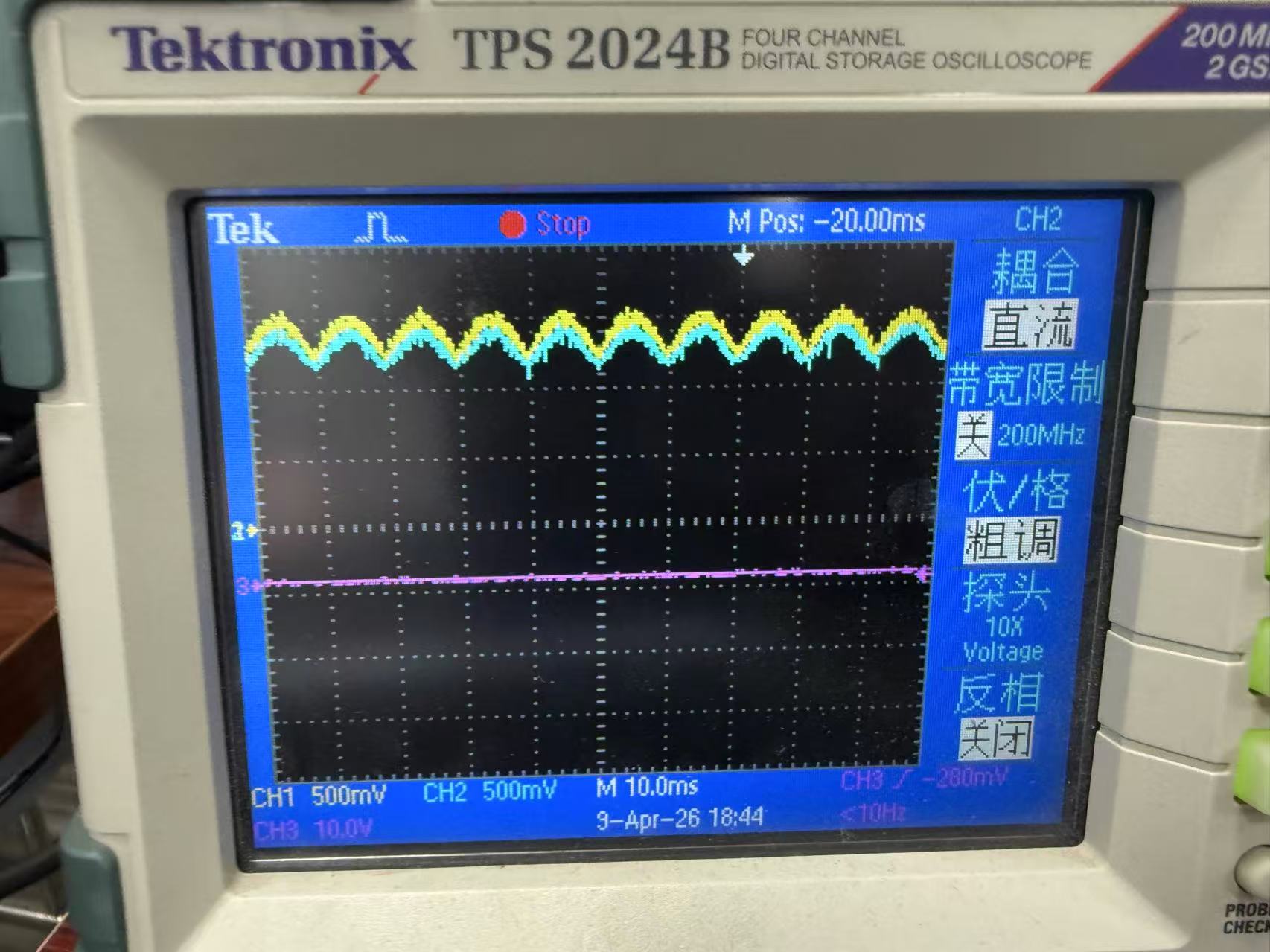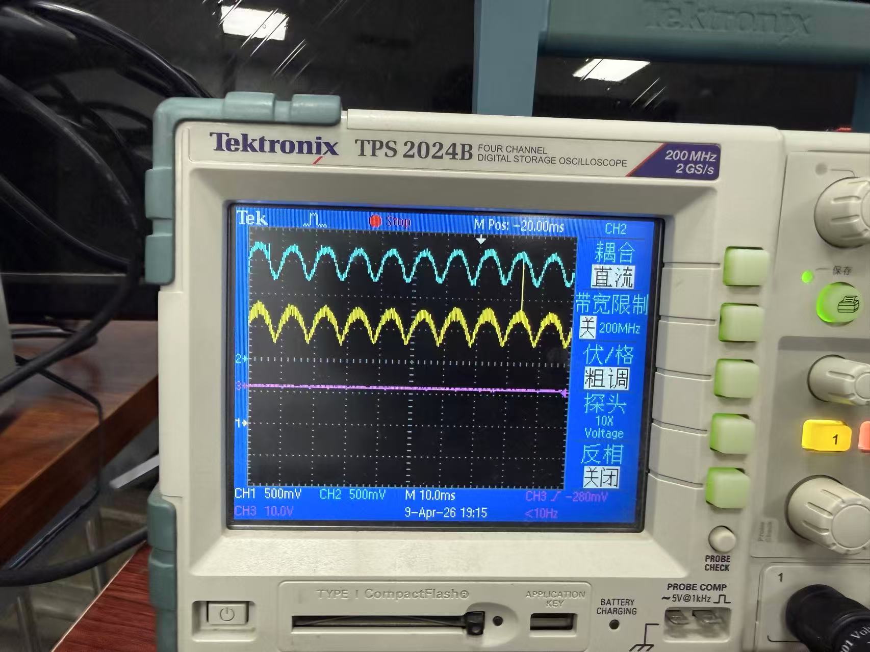 图2所示为接了工作在CV模式的电子负载,可以看到电压电流波形都成为馒头波。
